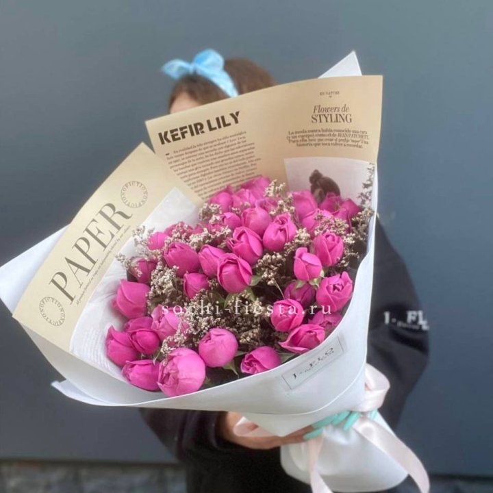 В сезон (весна и лето) ассортимент шире: пионы, ранункулюсы, тюльпаны местные и голландские, ромашки, гортензия. Круглый год — розы от 50 см стебель, кустовые хризантемы, альстромерия, гипсофила, эустома, гвоздики, эвкалипт для миксов.