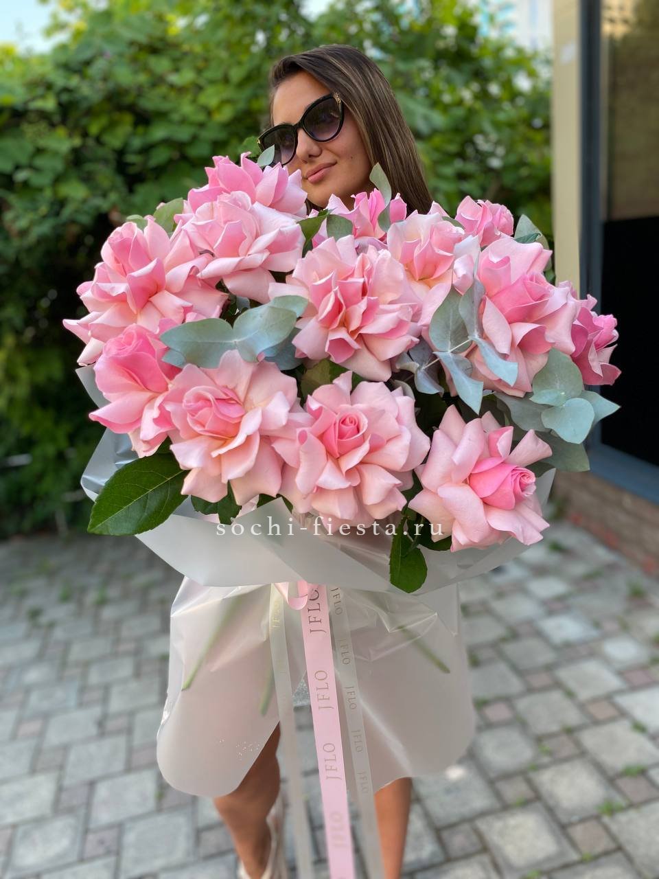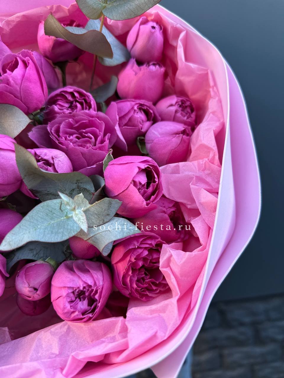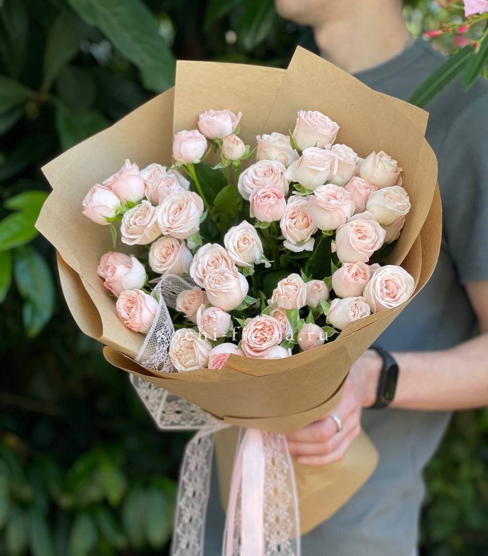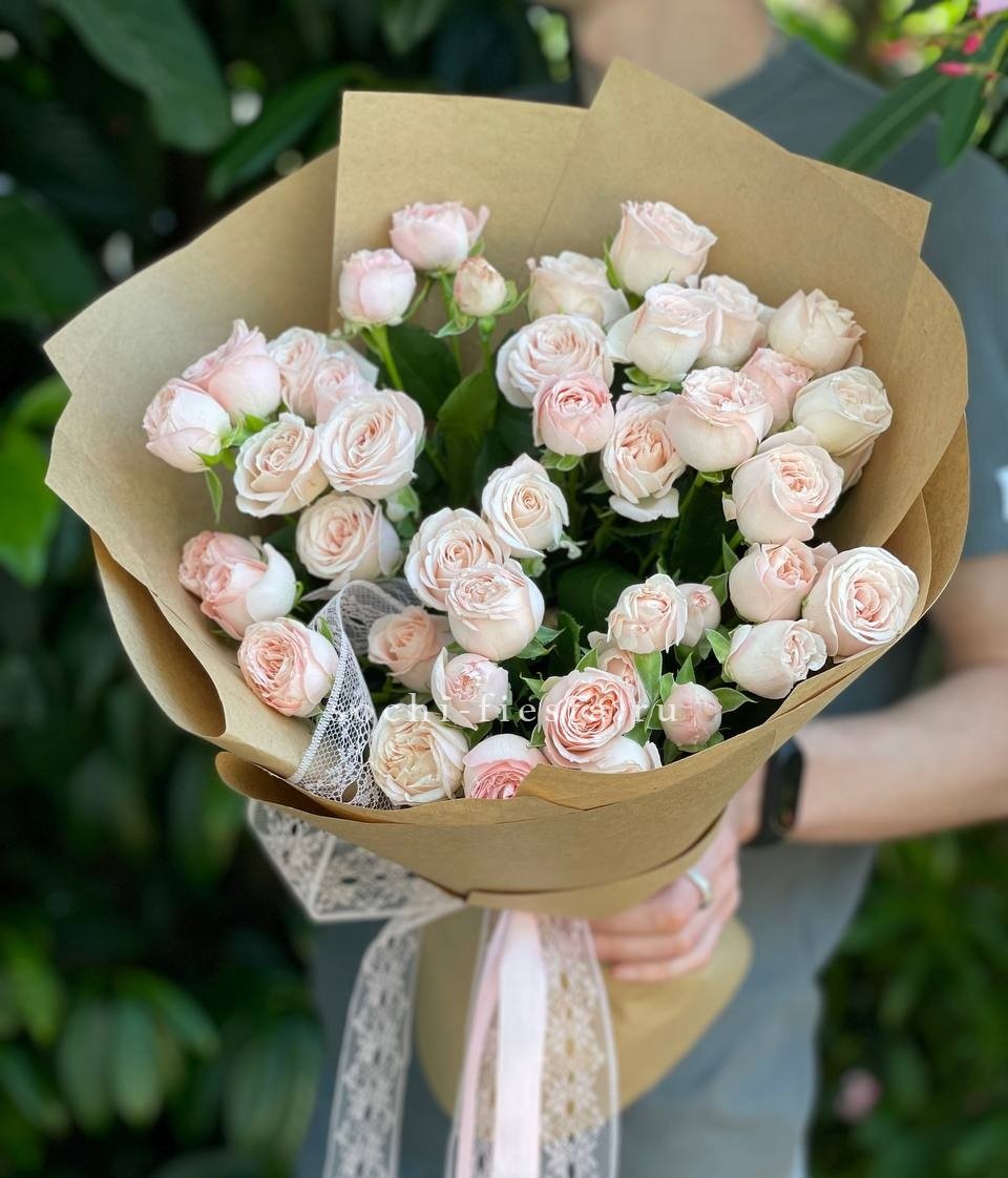 Тринадцать пионовидных роз Мисти Бабблс с плотными многослойными бутонами персиково-кремового тона. Округлая форма букета подходит для подарка без лишних деталей.