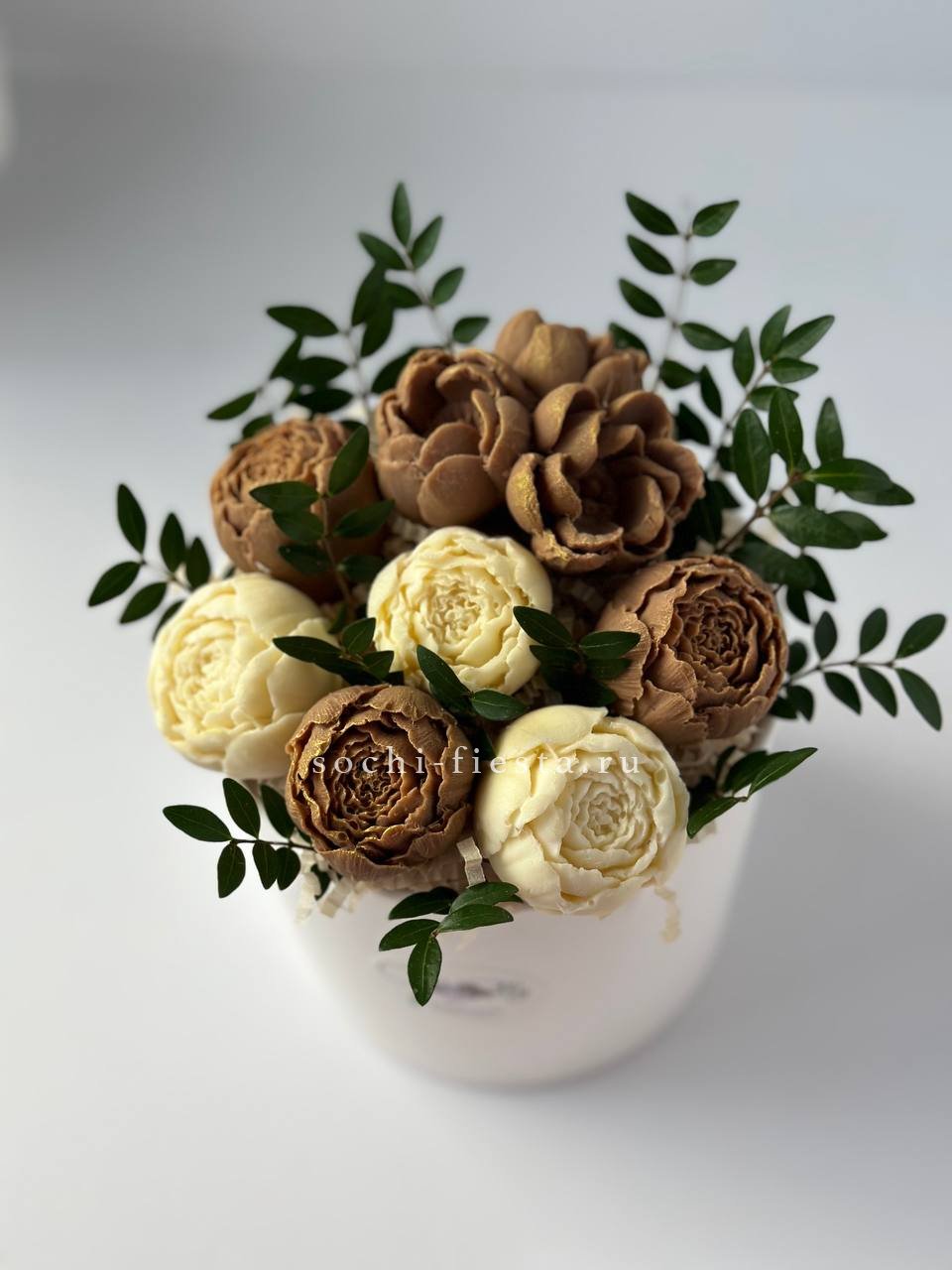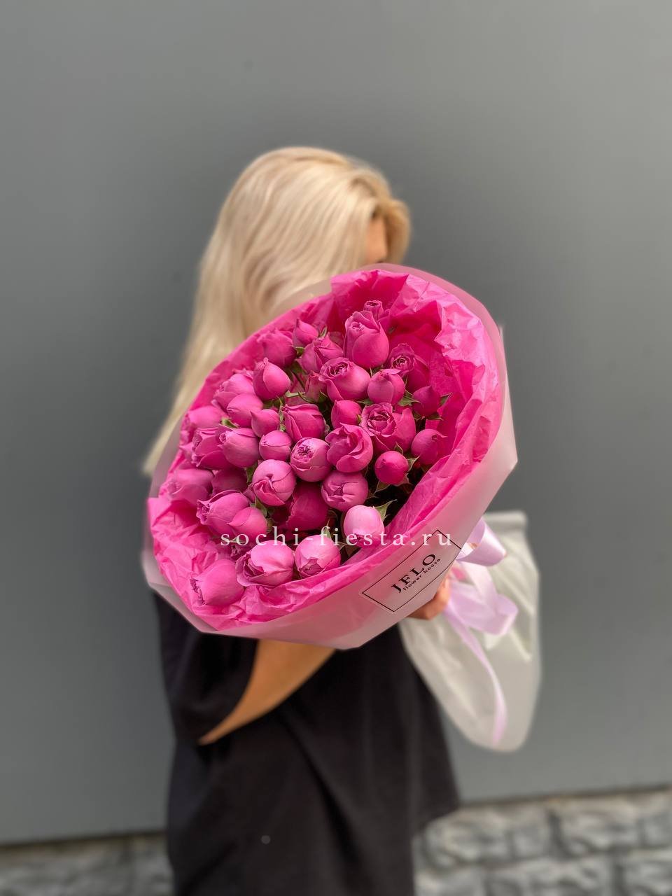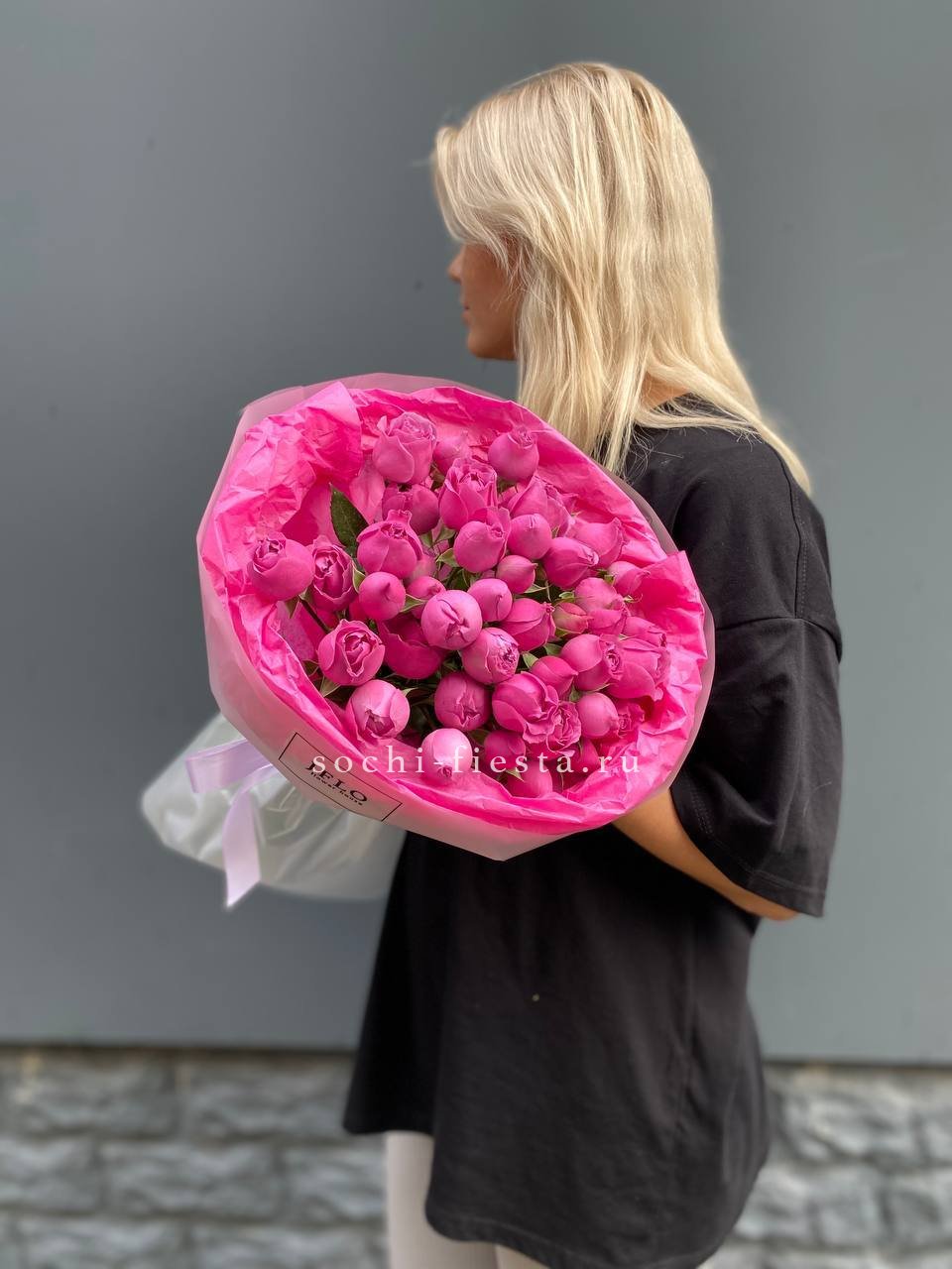 Тринадцать пионовидных роз Мисти Бабблс с плотными многослойными бутонами персиково-кремового тона. Округлая форма букета подходит для подарка без лишних деталей.