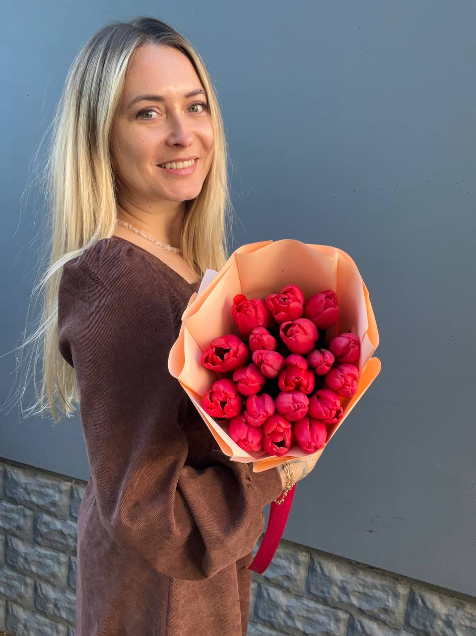 Девятнадцать бутонов собраны в плотную охапку, где каждый стебель держит свою линию. Красный оттенок звучит чисто и открыто, без лишних деталей. Букет готов говорить сам за себя.
