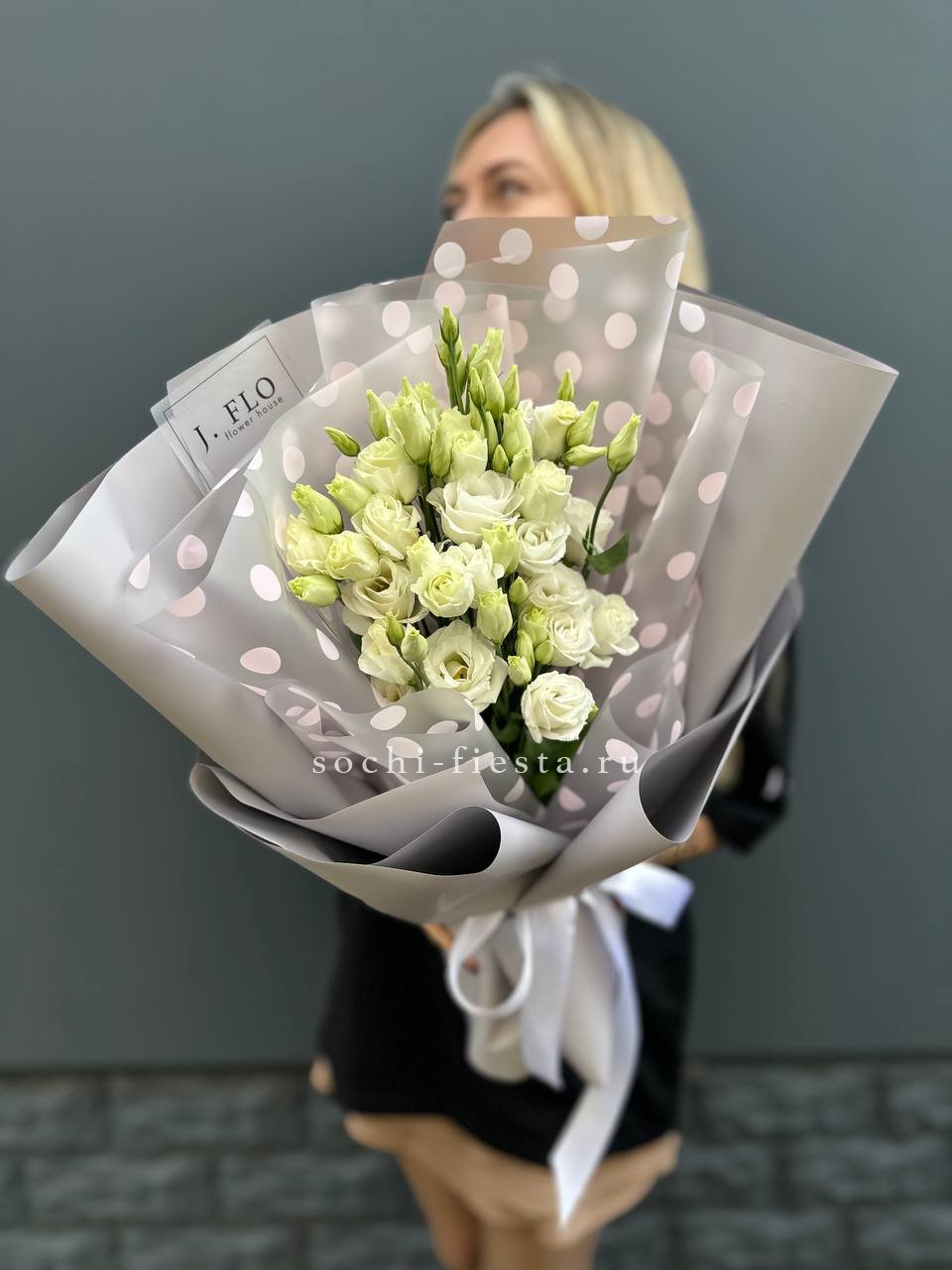 Сорок один белоснежный бутон в бархатной коробке создает композицию с безупречной симметрией. Плотная сборка и свежая зелень эвкалипта добавляют глубину и завершенность.