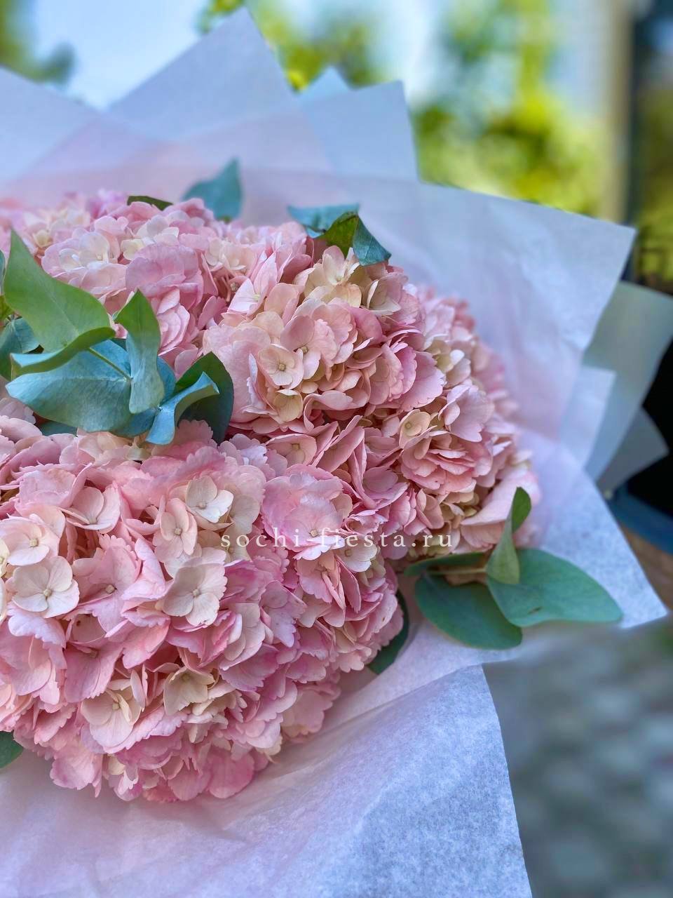 Пять соцветий розовой гортензии в обрамлении матовых веточек эвкалипта. Сочная палитра и продуманная форма делают этот букет удобным для размещения даже в компактном пространстве.