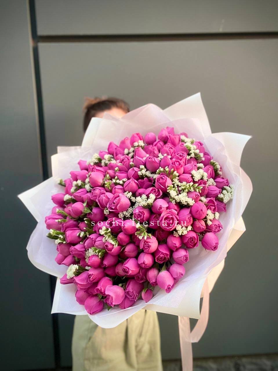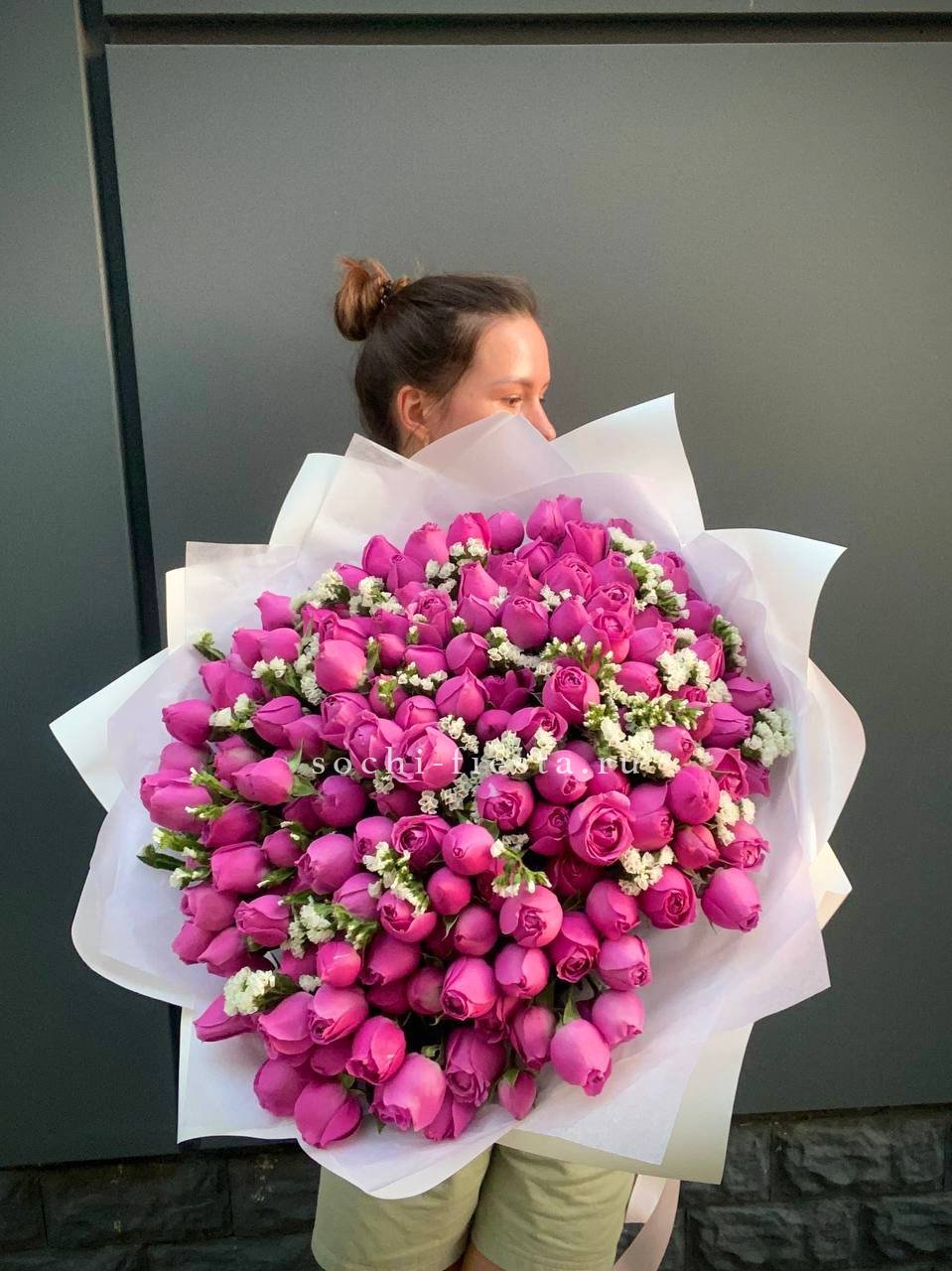 Пятьдесят один бутон пионовидной розы Мисти Баблс формируют пышное облако лилового оттенка. Статица добавляет графичности и поддерживает общий ритм композиции