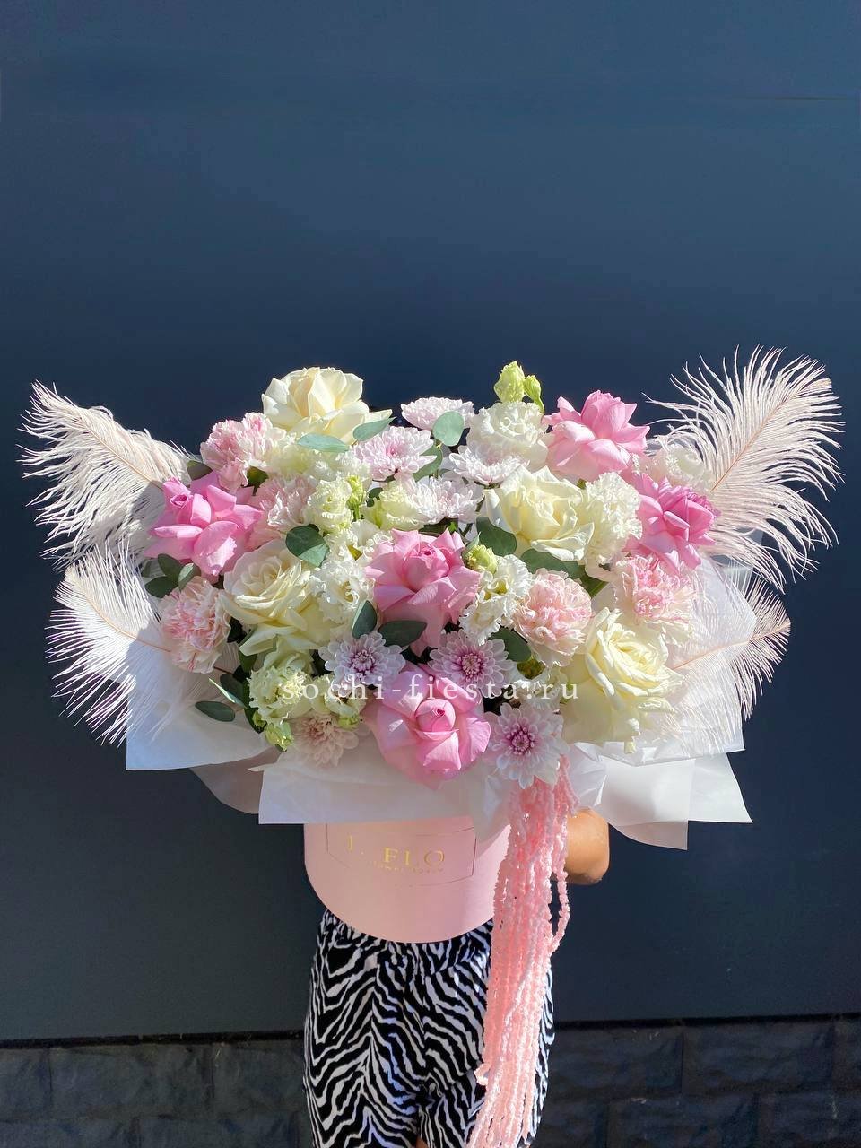 Пышные розы Бомбастик собраны в плотную округлую форму и дополнены воздушными соцветиями эустомы. Диантус добавляет фактурные акценты, а эвкалипт создает мягкий контур по краю композиции. Букет выглядит объемно и держит форму благодаря плотной сборке.