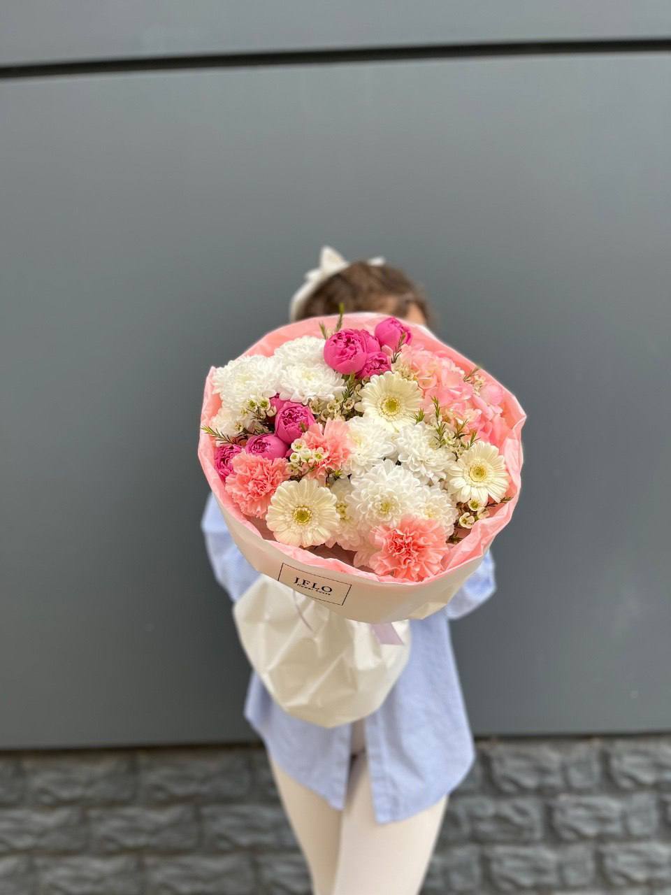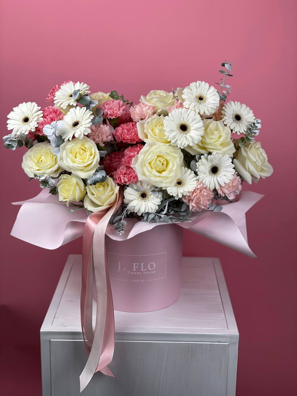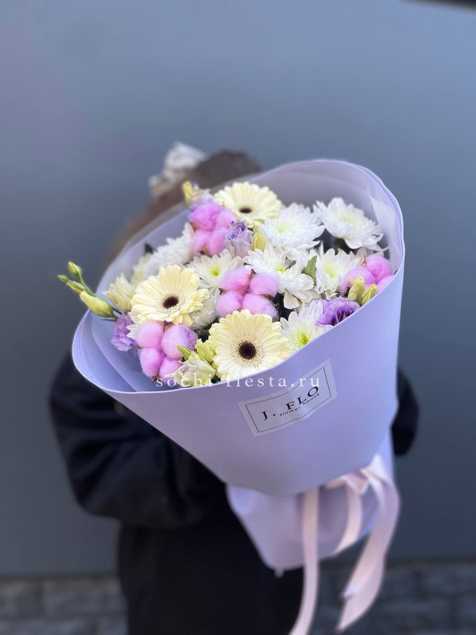Белоснежные розы и герберы соседствуют с пушистыми шапками хризантем и воздушной статицей. Хлопок добавляет фактурный акцент, делая композицию объёмной и запоминающейся.