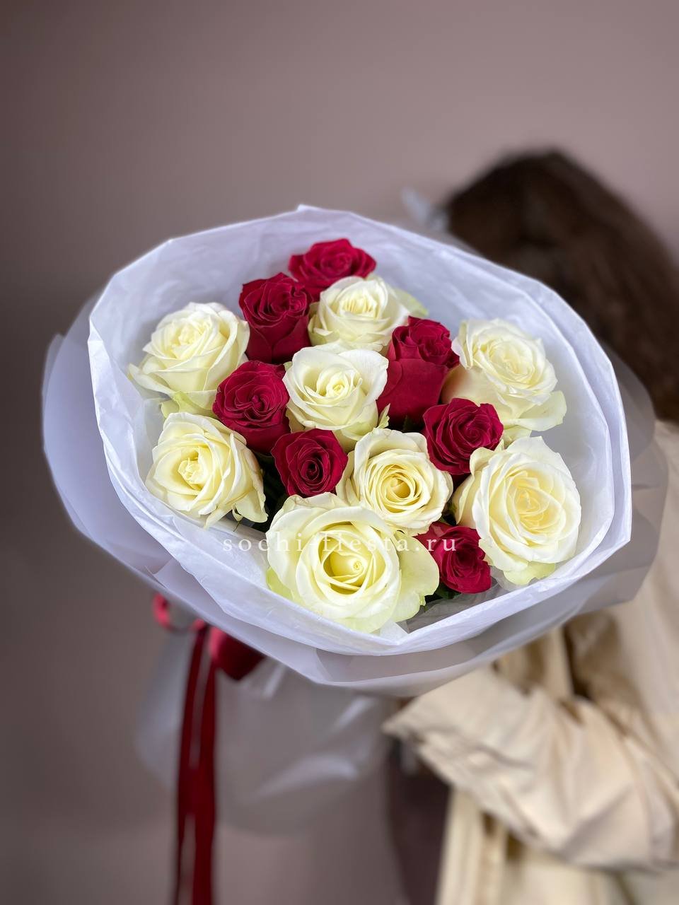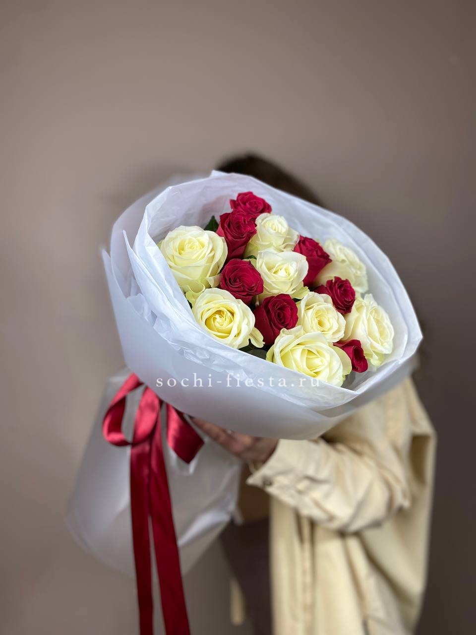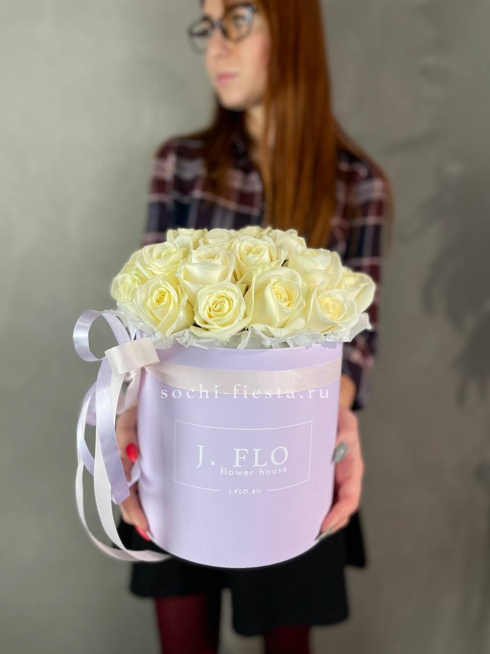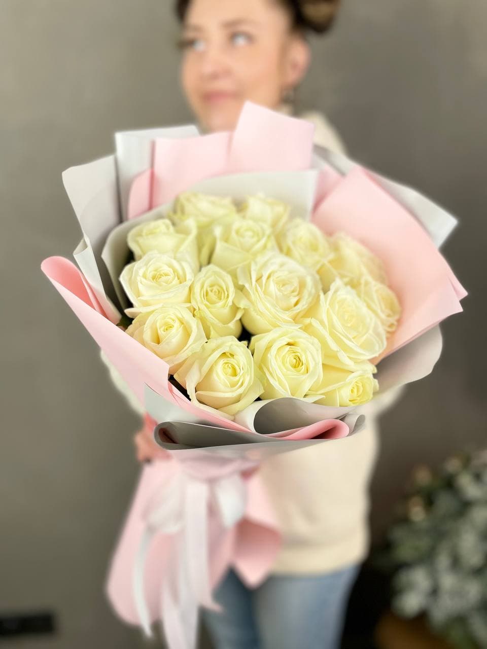 Белоснежные розы и герберы соседствуют с пушистыми шапками хризантем и воздушной статицей. Хлопок добавляет фактурный акцент, делая композицию объёмной и запоминающейся.