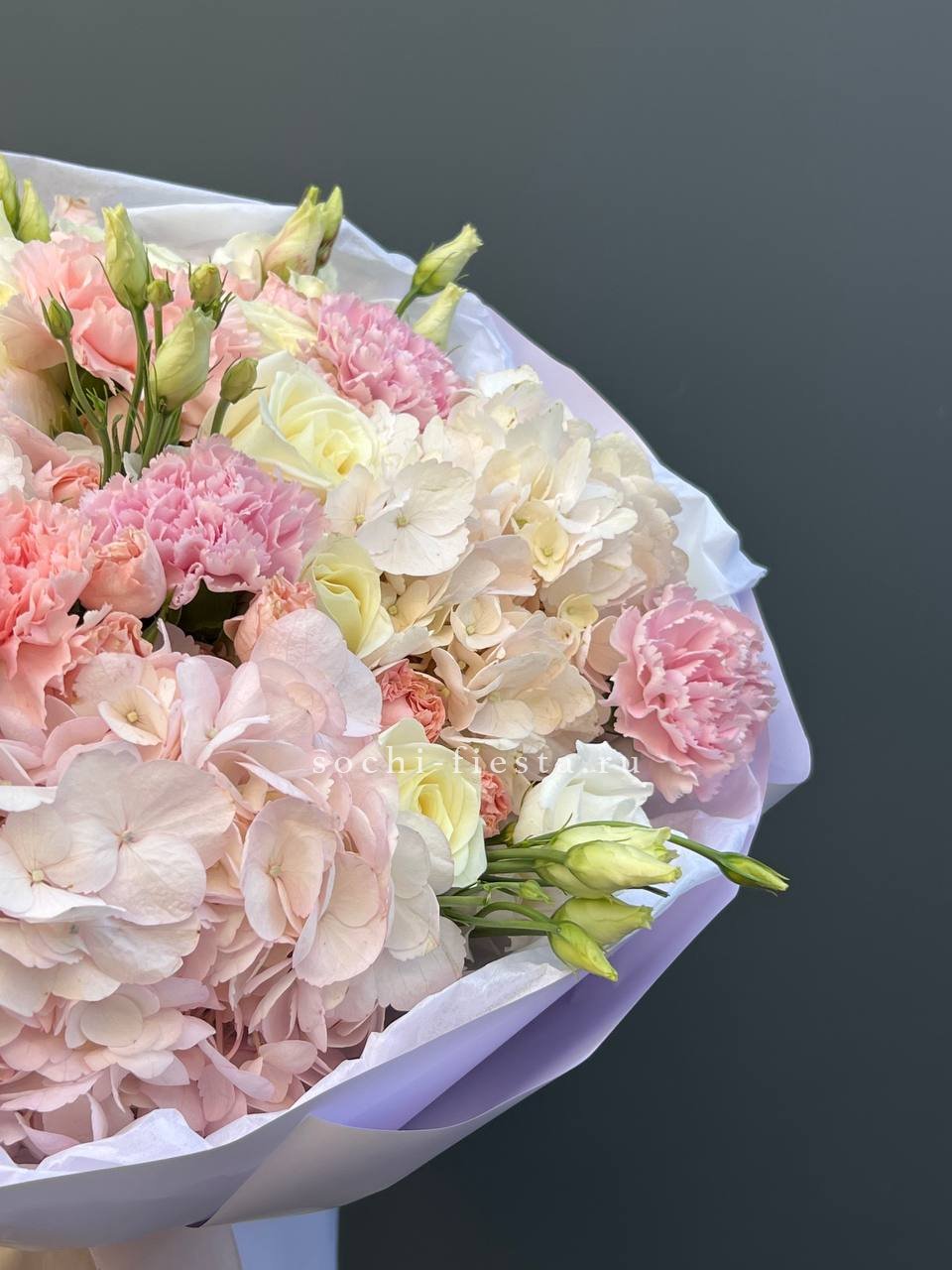 Крупные шапки гортензий формируют основу композиции, розы и эустомы заполняют пространство между ними. Диантусы добавляют графичности. Букет с впечатляющим присутствием и богатой палитрой.