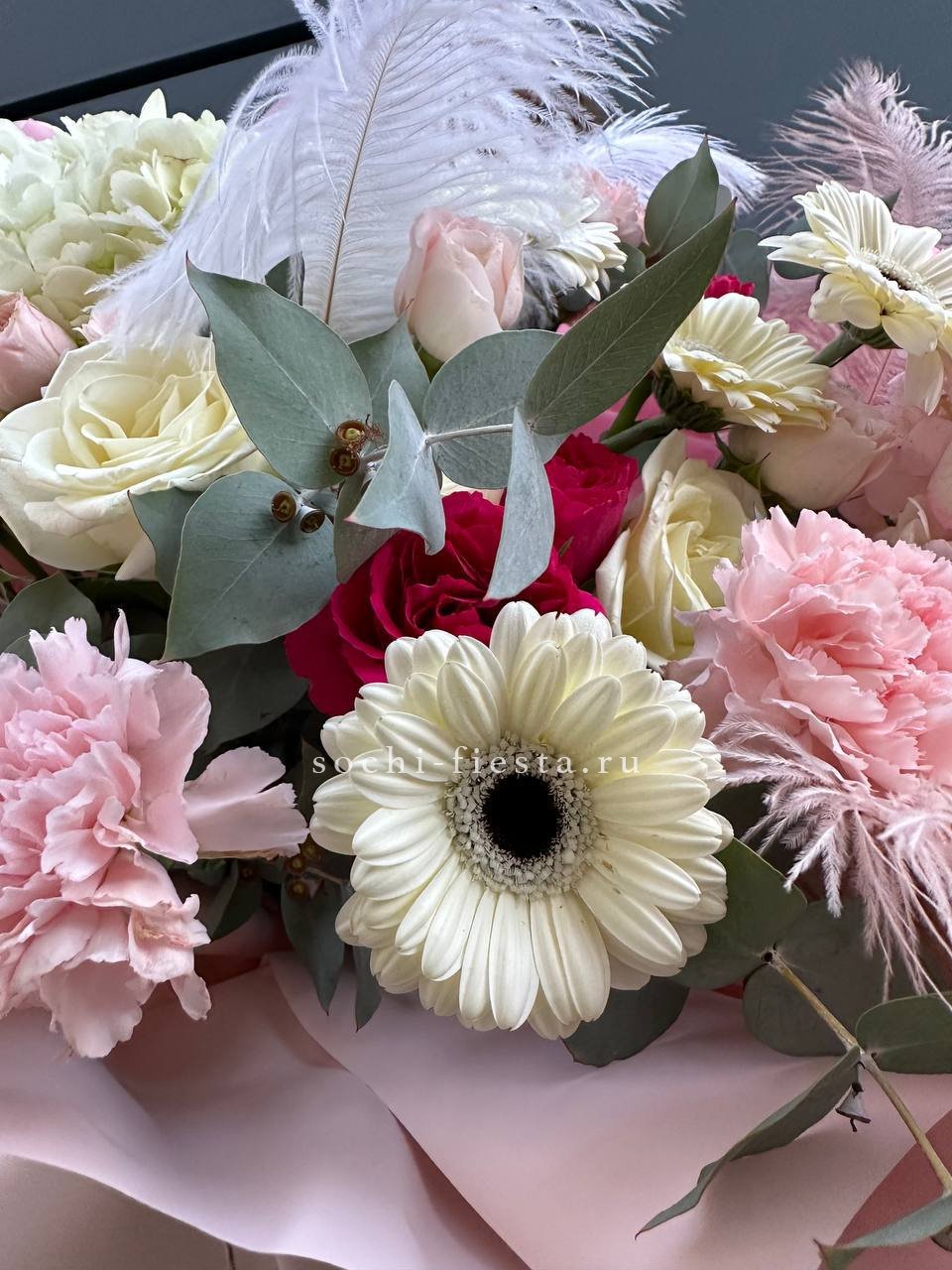 Белые розы и эустома раскрываются полными бутонами среди мелких соцветий диантуса и хризантем. Свежая зелень эвкалипта добавляет композиции глубину и завершённость.