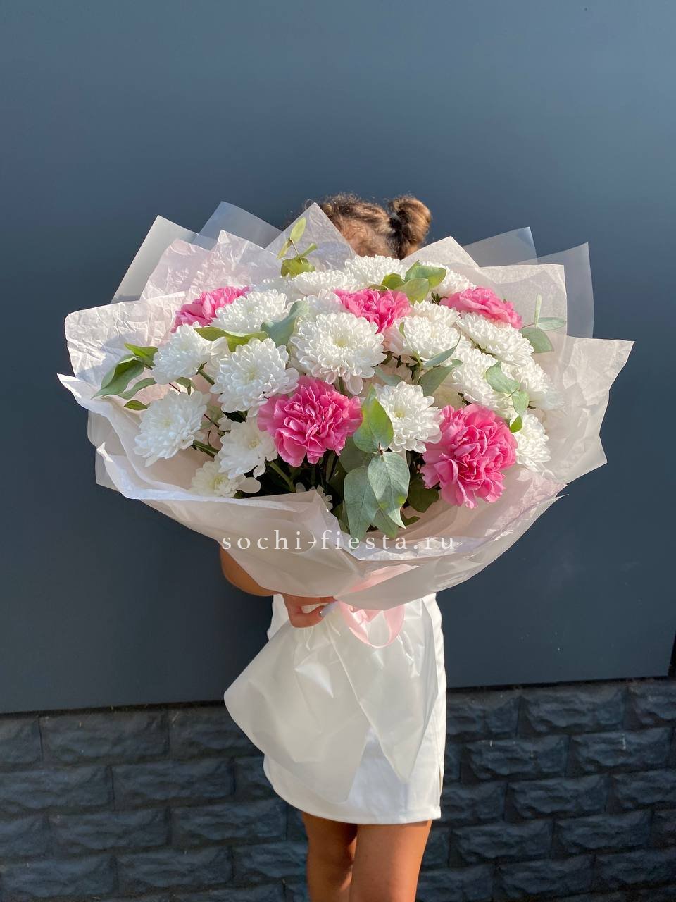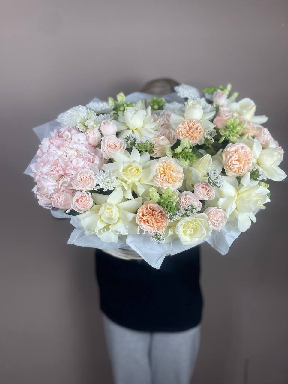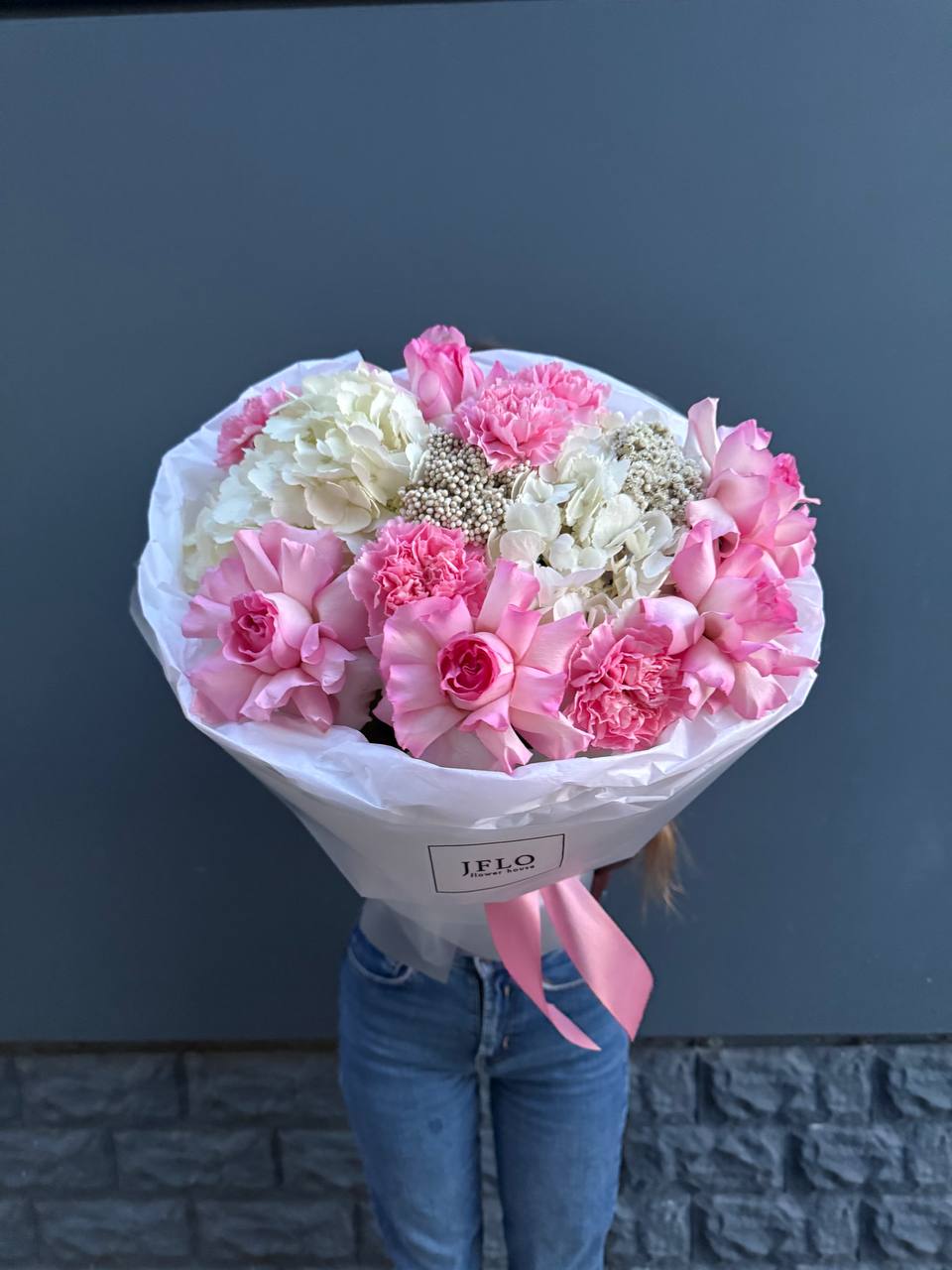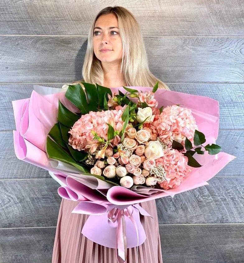 Розовая гортензия и эустома раскрывают свою красоту в каждом лепестке. Мягкие оттенки переходят один в другой, создавая спокойное и гармоничное впечатление.