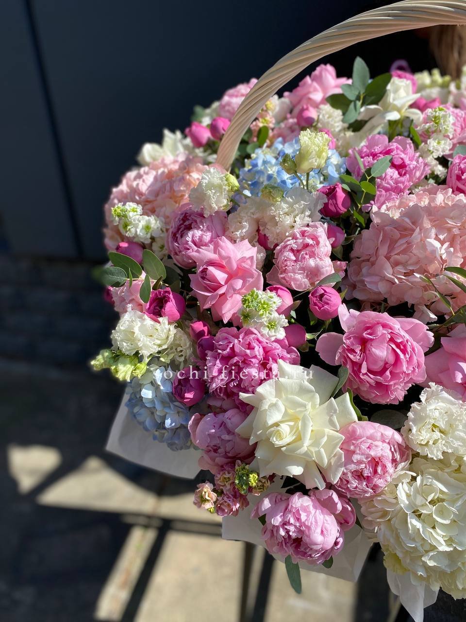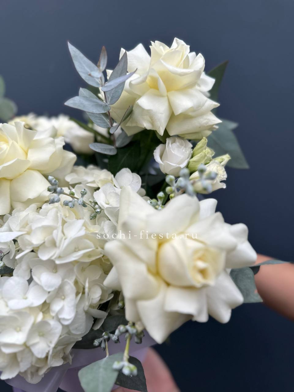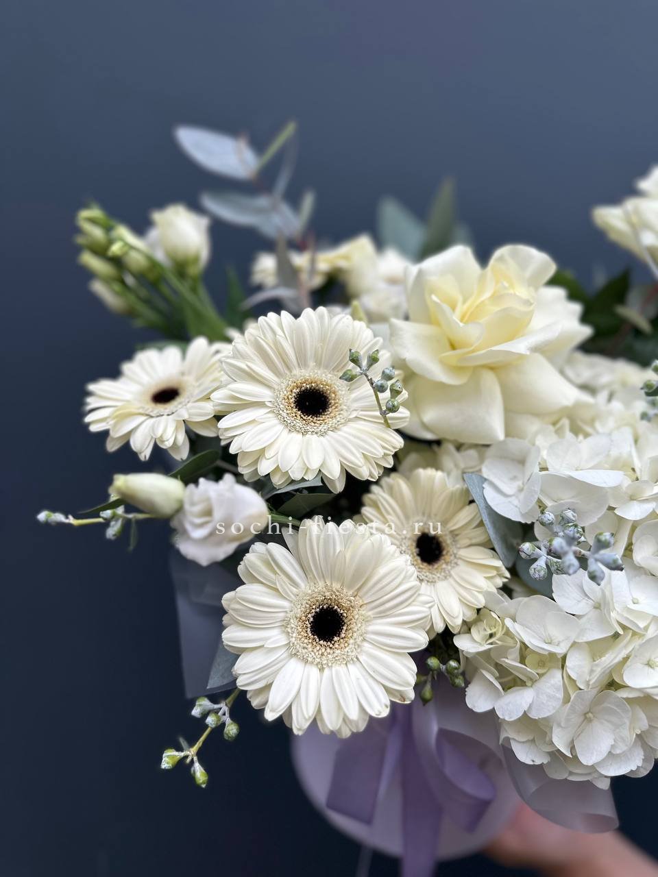Лавандовые оттенки переходят в персиковые и розовые полутона. Гортензия создаёт пышную основу, а эустома и герберы расставляют яркие акценты. Композиция выглядит воздушно и свежо.