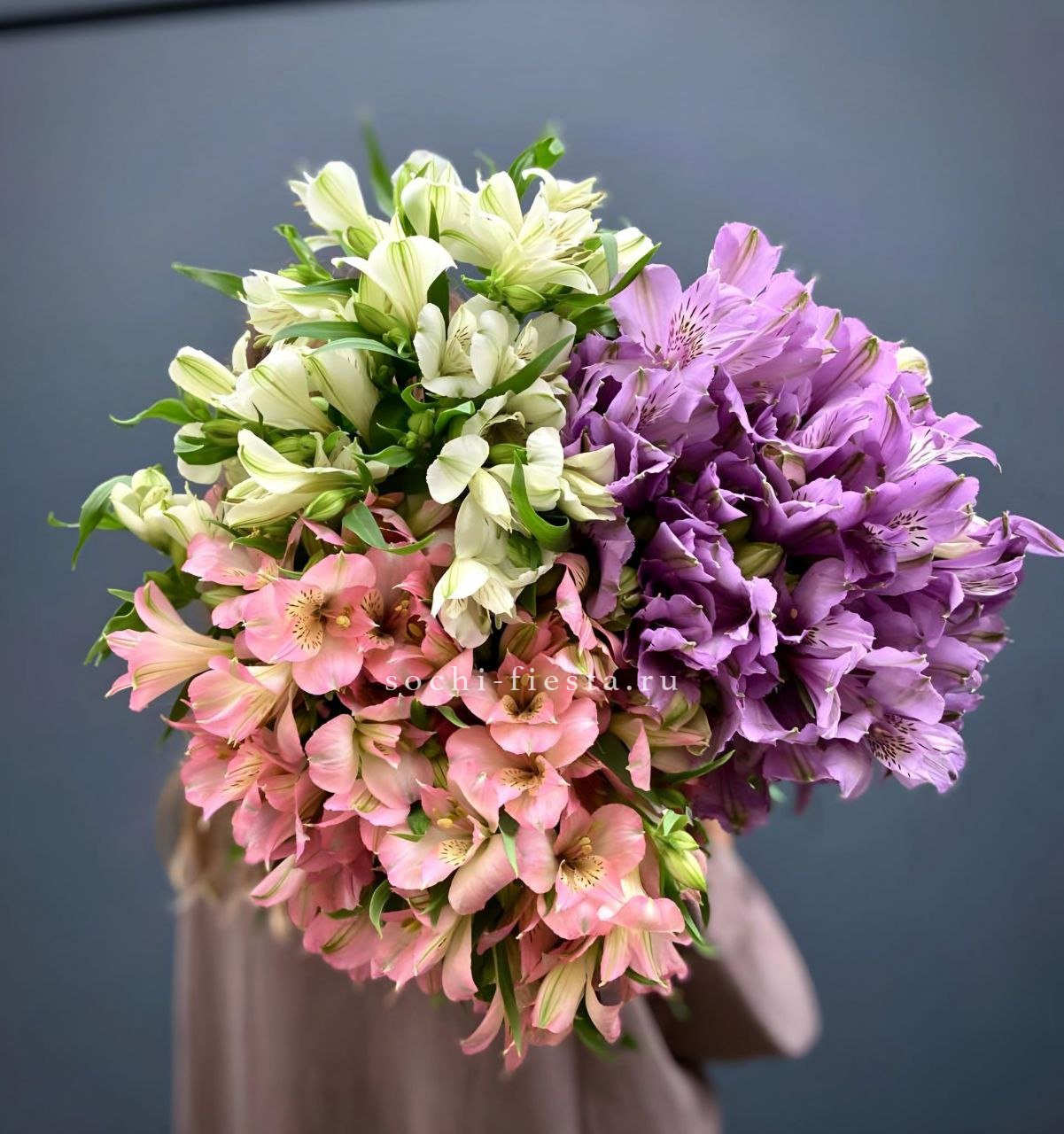 Яркие многолепестковые бутоны альстромерии раскрываются на длинных стеблях и создают живую динамику. Каждый цветок добавляет охапке лёгкости и свежести. Простая форма с насыщенным характером.