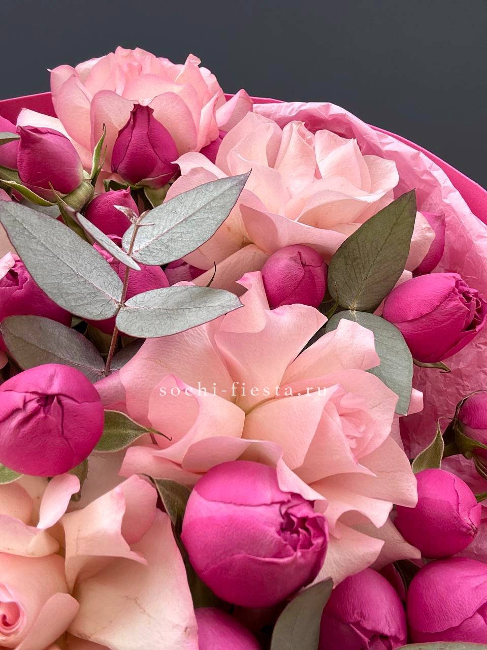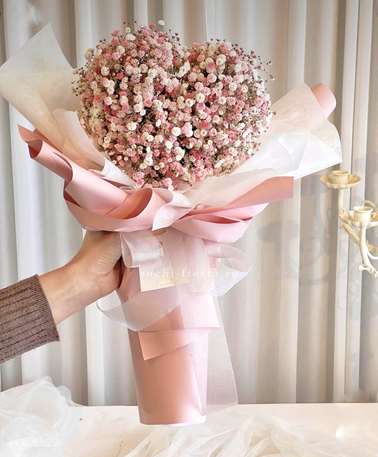 Пять веток радужной гипсофилы закреплены в форме сердца на флористической основе. Компактная композиция с яркими переливами держит заданный силуэт.