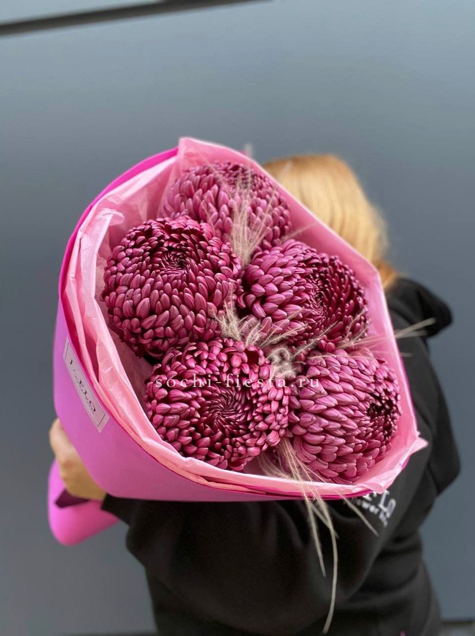 Хризантемы сорта Бигуди раскрываются пышными головками с игольчатыми лепестками. Стифа добавляет объем и создает легкую дымку вокруг ярких соцветий.