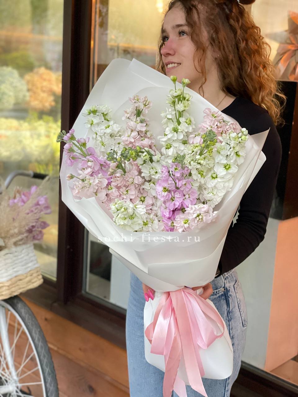 Тринадцать веток маттиолы с густыми соцветиями и бархатными лепестками. Букет компактный, но с заметным присутствием благодаря насыщенному цвету и волнам аромата, которые распространяются мгновенно.