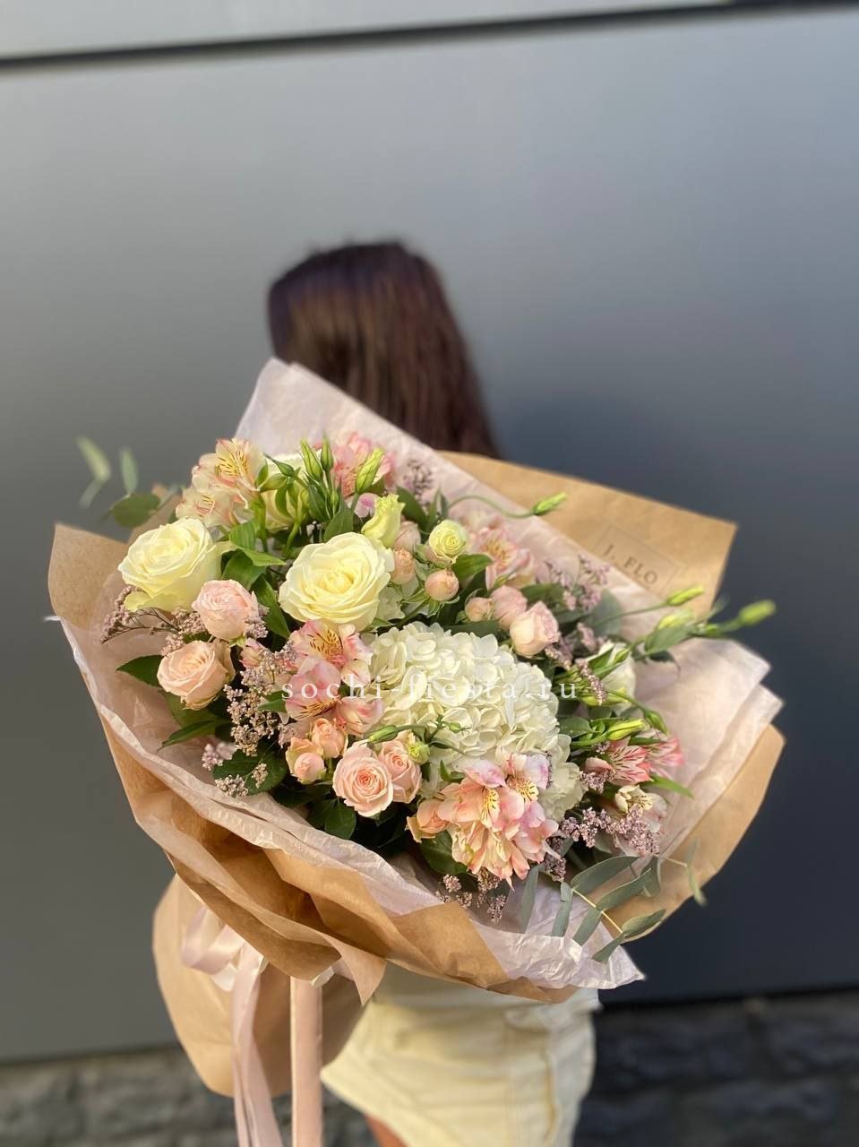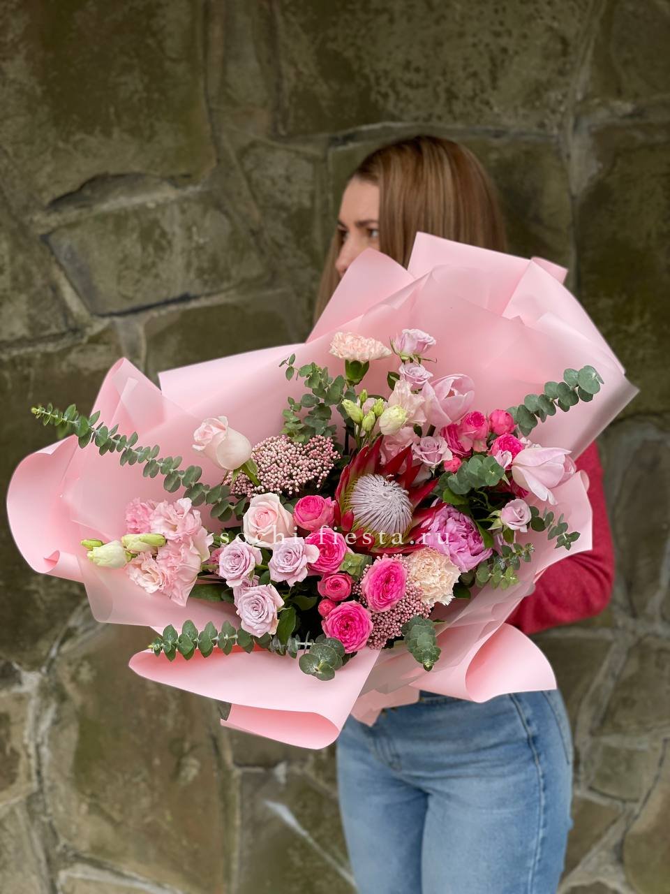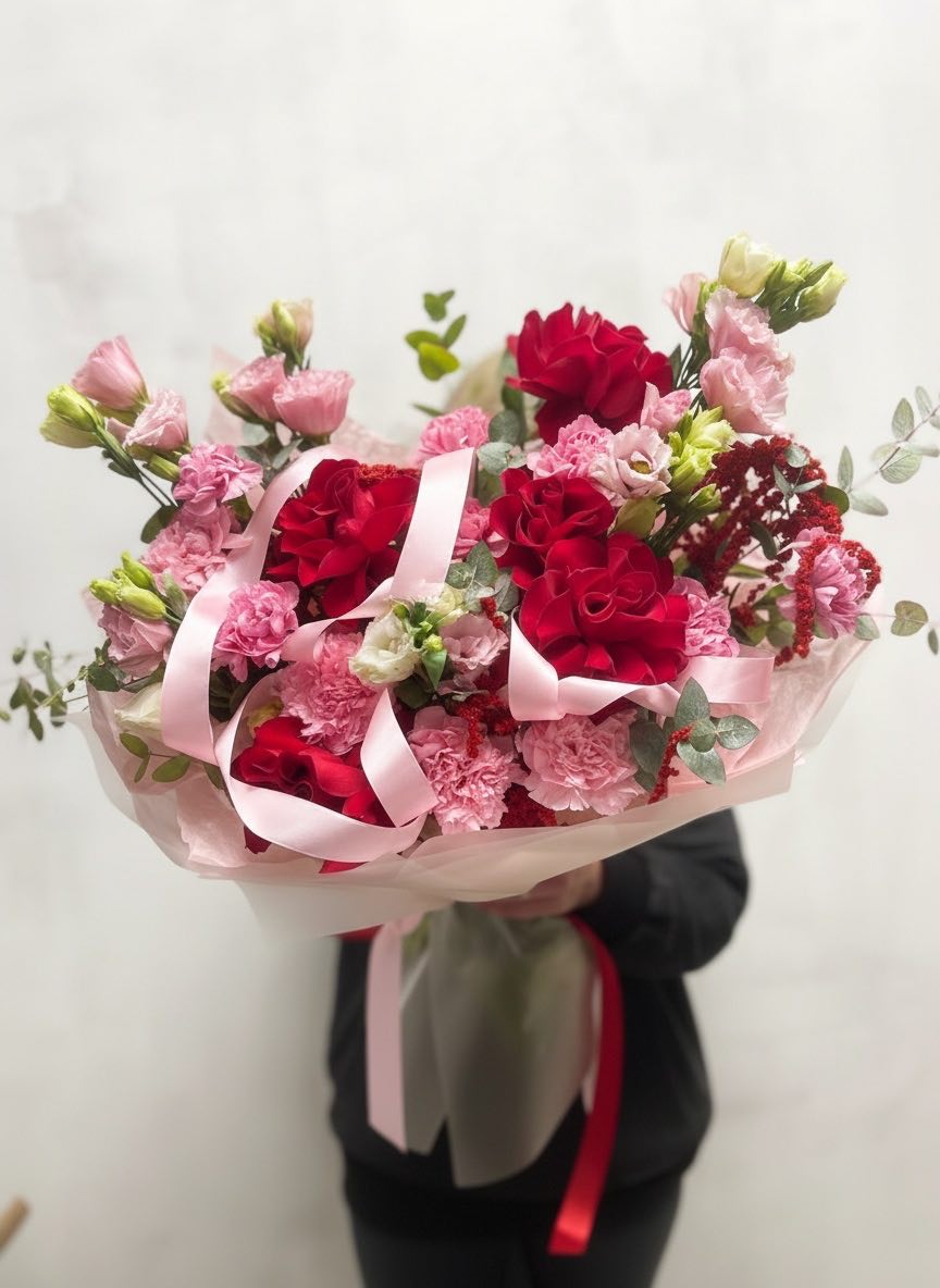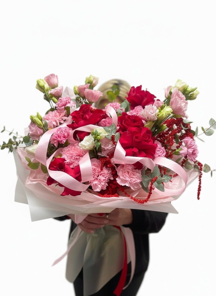 Протея задаёт графичный центр композиции, вокруг которого раскрываются розы и воздушная эустома. Диантус добавляет текстурные пятна, а эвкалипт смягчает линии. Букет с характером и выразительной архитектурой.
