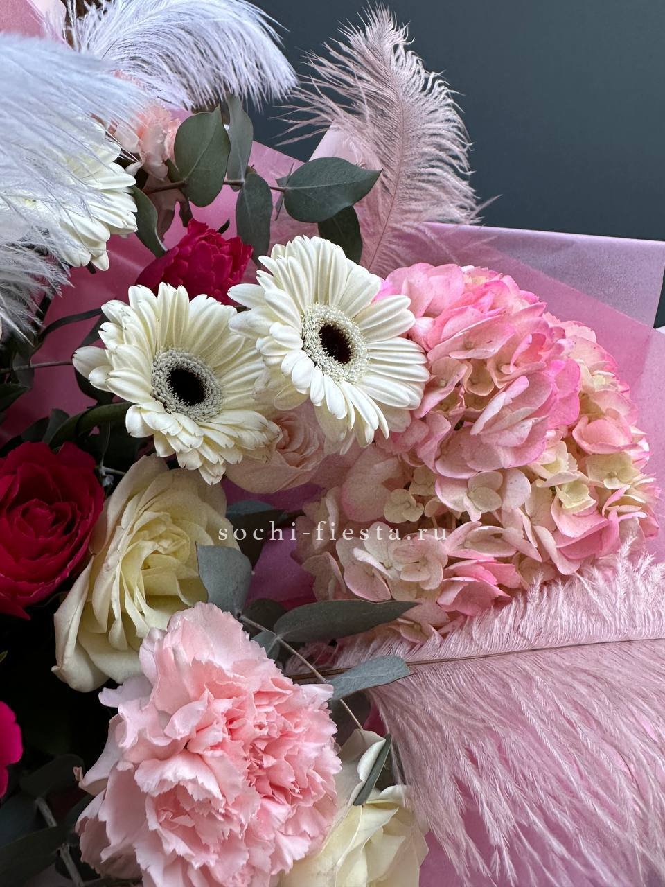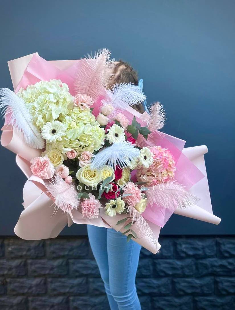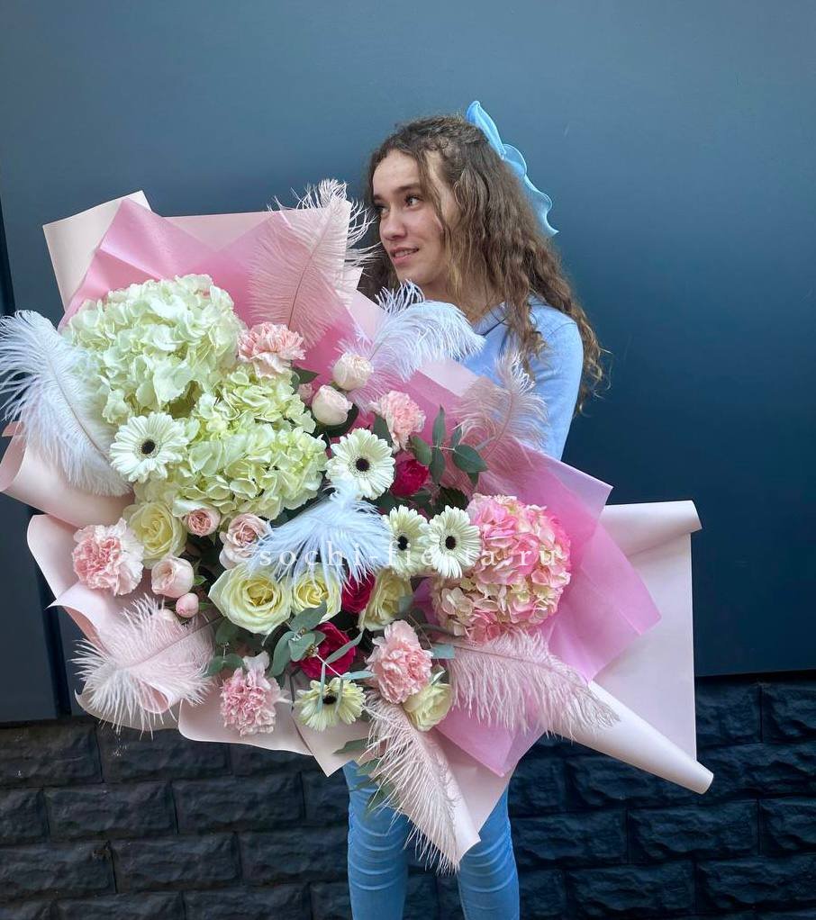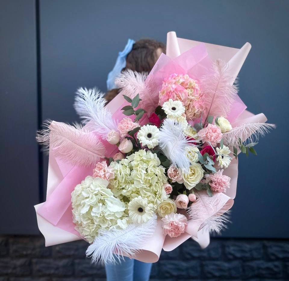 Пышный микс соцветий гортензии, роз и гербер с добавлением перьев и озотамнуса. Авторская композиция объединяет садовую свободу и графичную точность линий. Для тех, кто ищет яркое решение с характером.