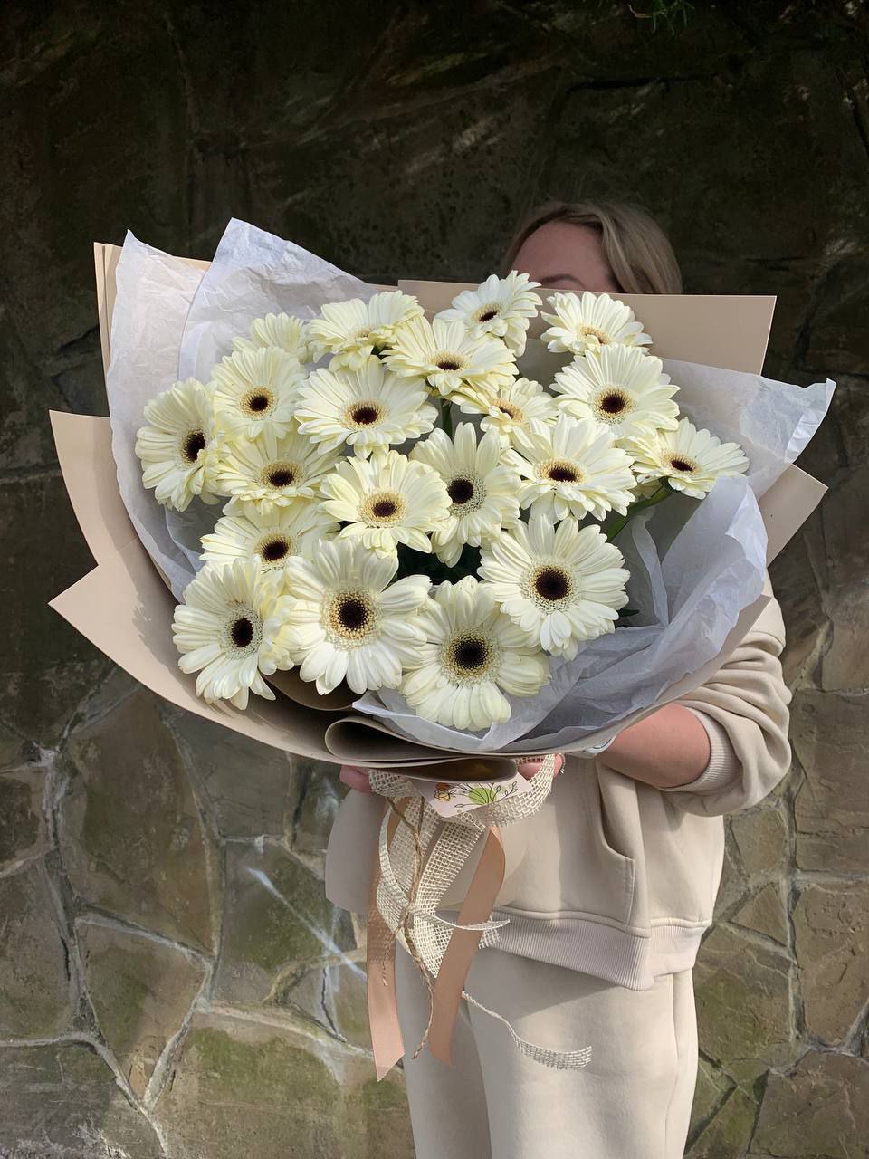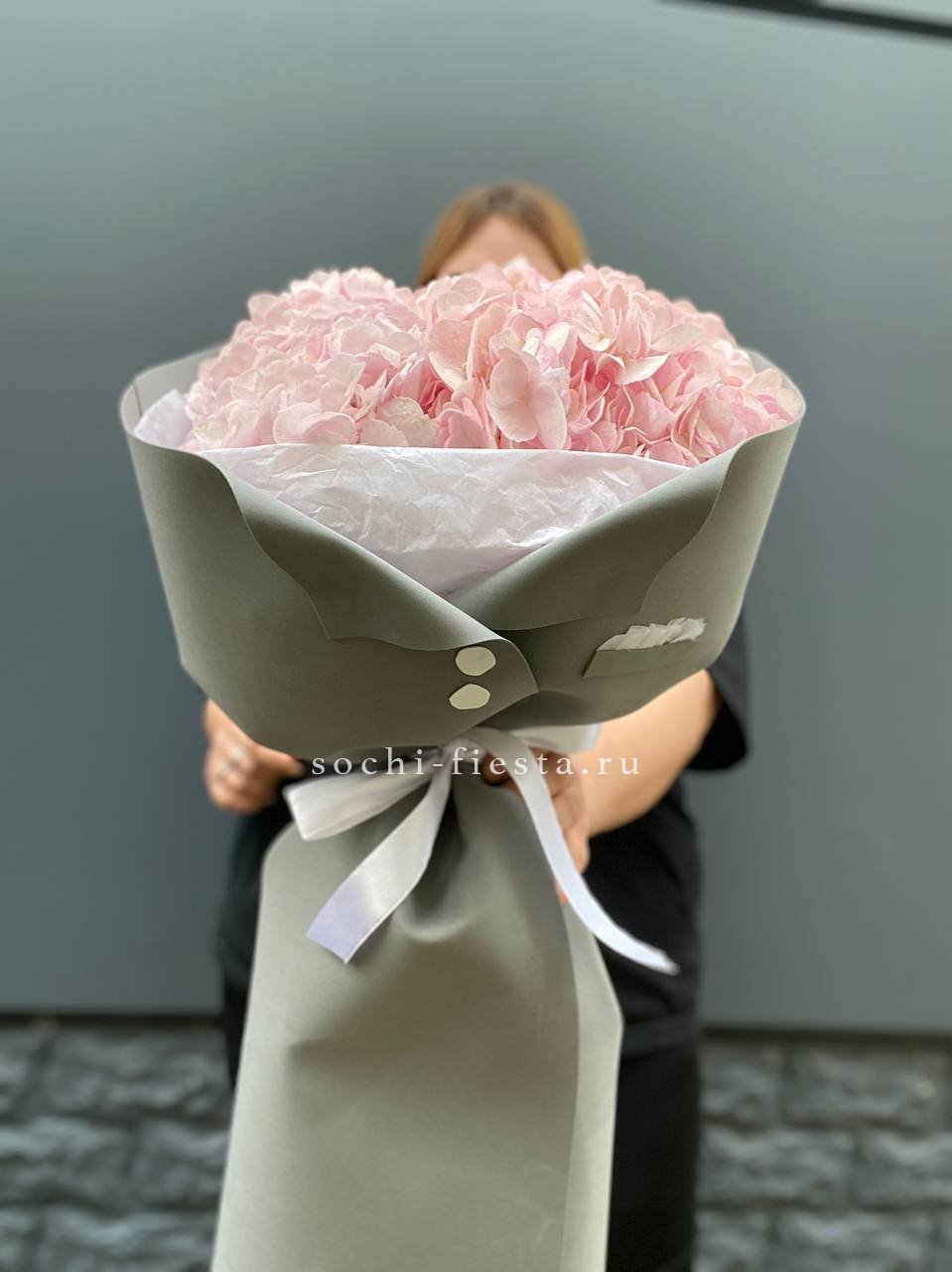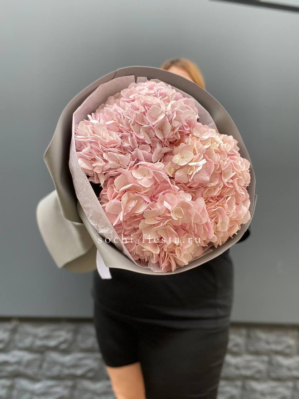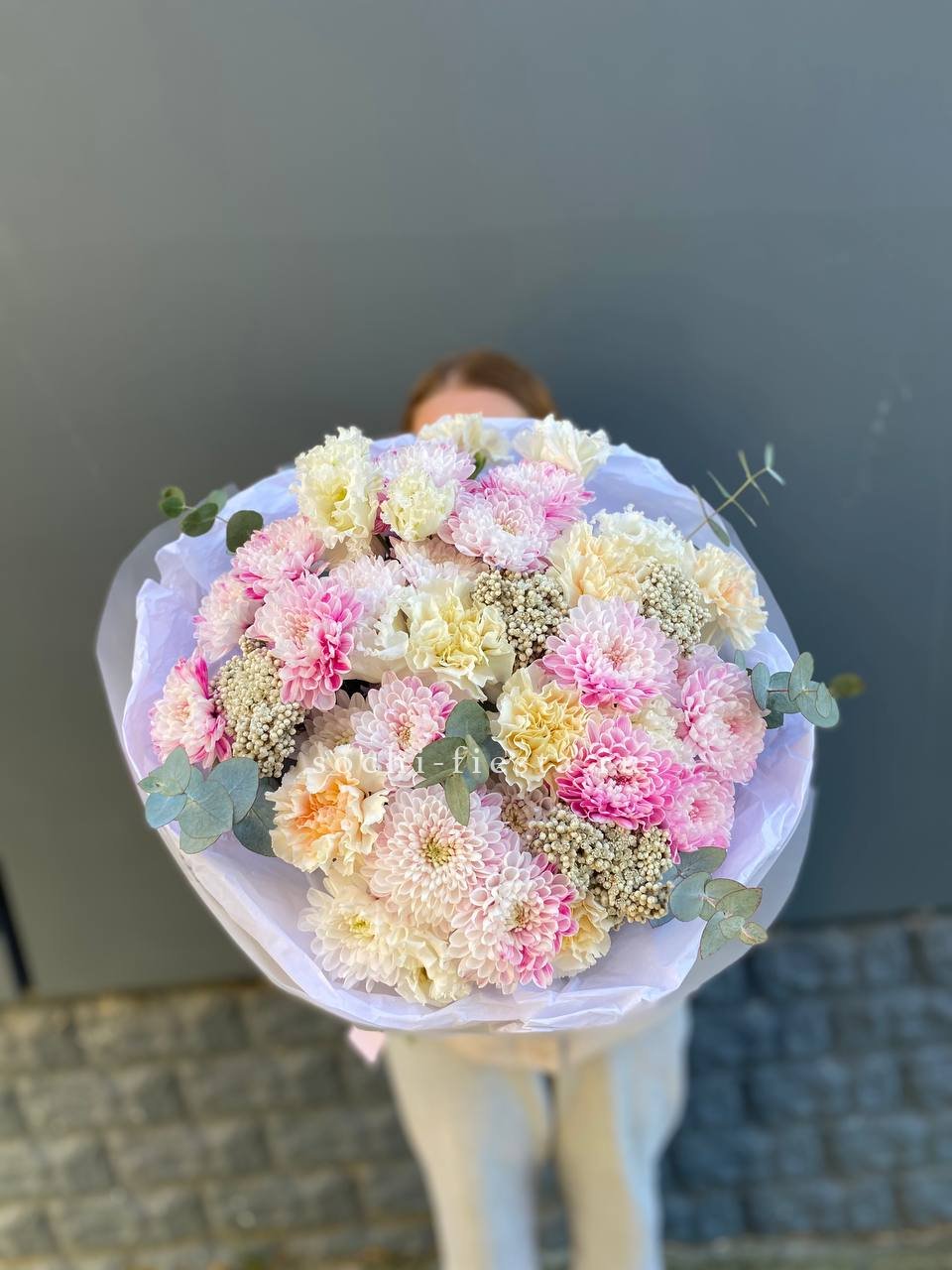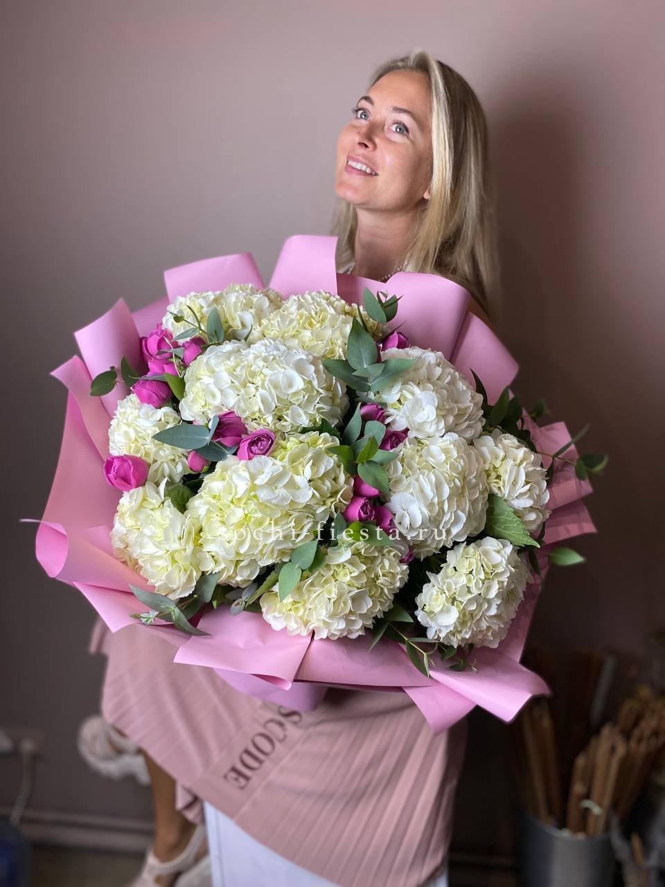 Гортензия и кустовые розы соединяются с веточками эвкалипта и ваксфлауэра в свободной композиции. Разная плотность соцветий создаёт живой ритм и природную лёгкость.