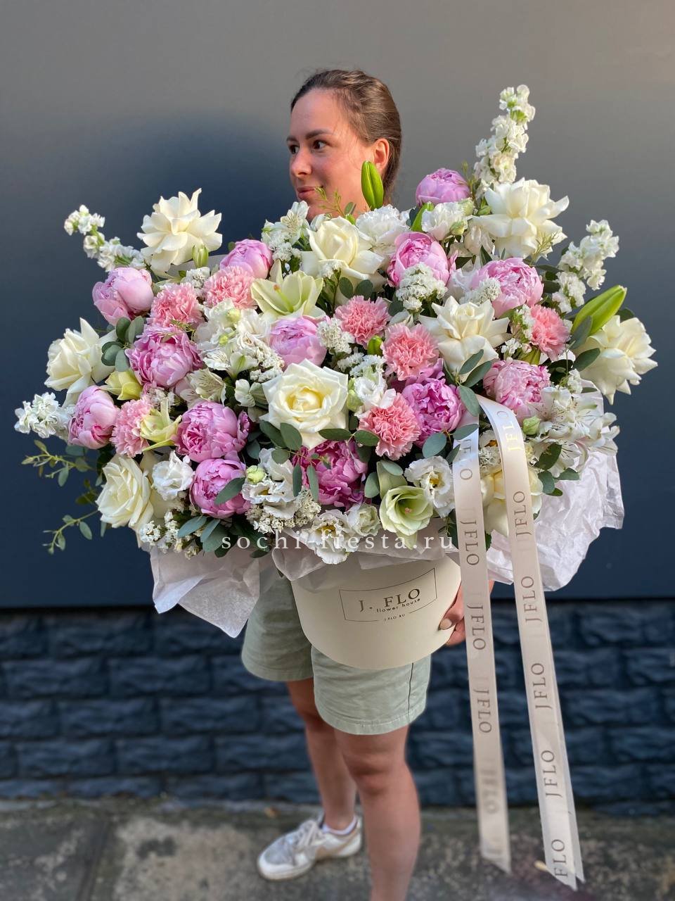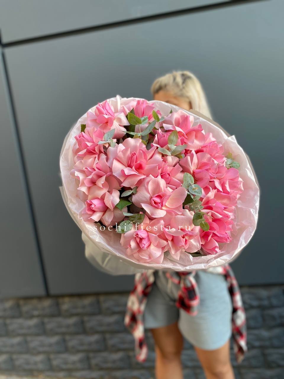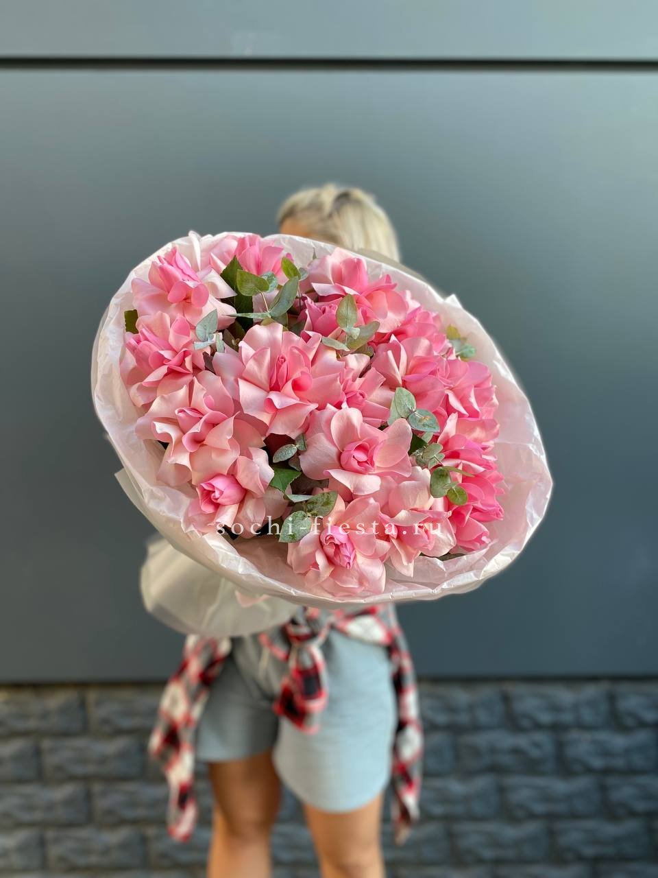 гортензия, кустовые розы, эвкалипт, ваксфлауэр (или аналог), лента, цилиндр D20.