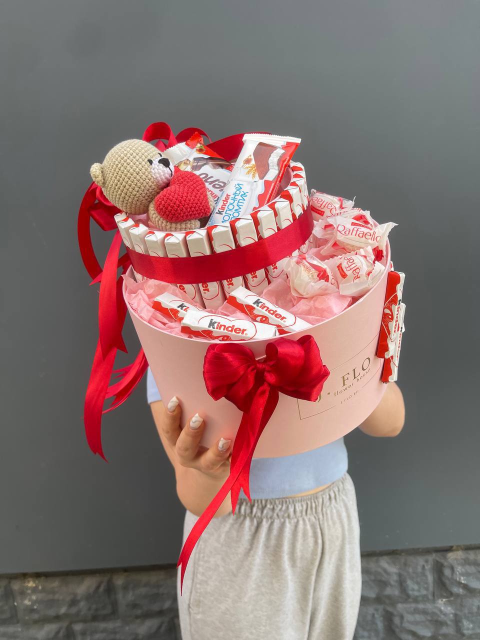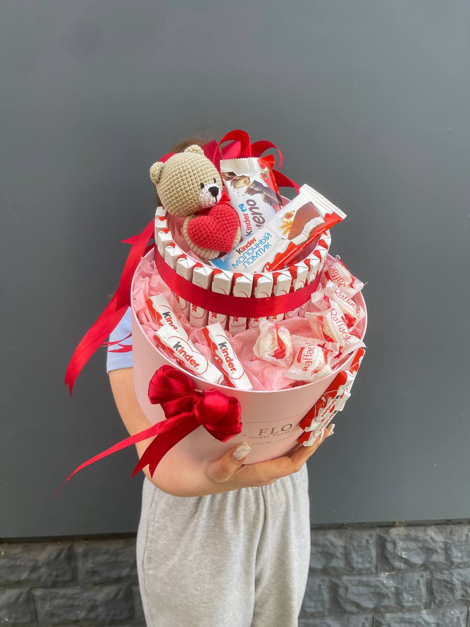 Kinder шоколад- 4уп., Kinder Bueno- 1шт., молочный ломтик- 1шт., Raffaello- 5шт., наполнитель, цилиндр-2шт., медведь.