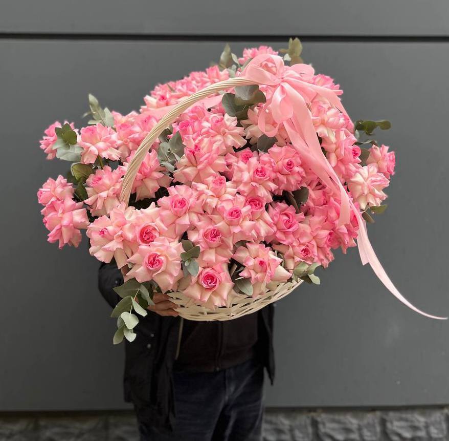 Розовые и алые головки роз собраны в плетёную корзину вместе с воздушной эустомой и серебристым эвкалиптом. Композиция держит форму и легко помещается на столе или комоде.
