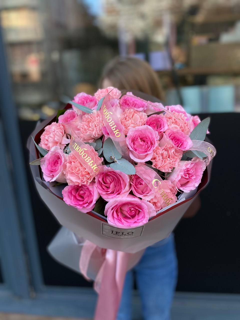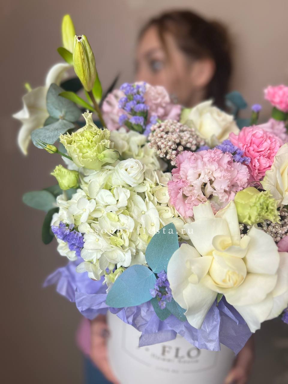 Композиция объединяет живые хризантемы и диантусы с ароматическим диффузором. Цветы сохраняют свежесть долго, а аромат наполняет пространство мягким шлейфом.