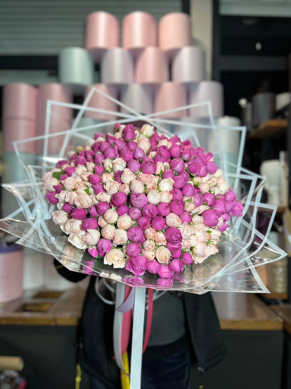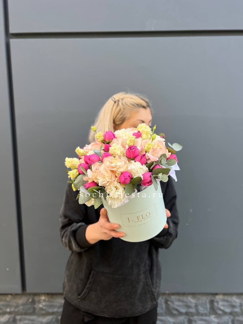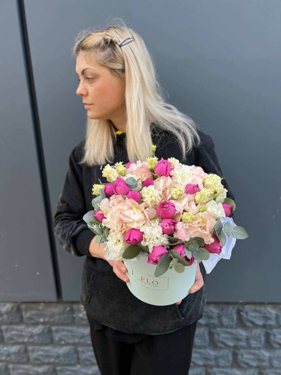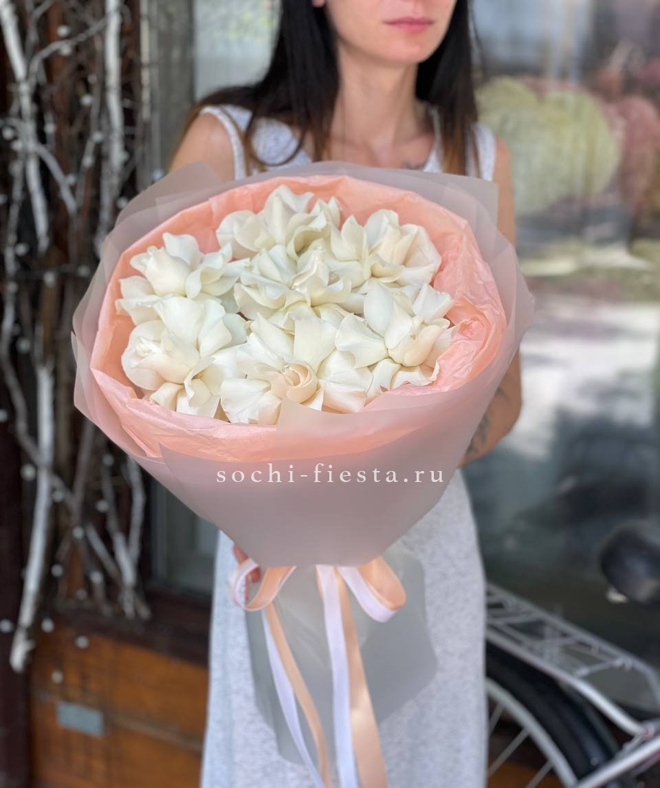 Вывернутые лепестки роз открывают внутреннюю текстуру бутонов и добавляют объема композиции. Гортензия и эустома заполняют пространство между крупными головками и создают многослойность.