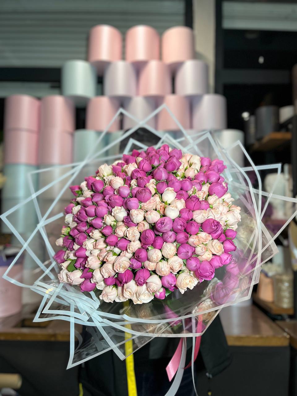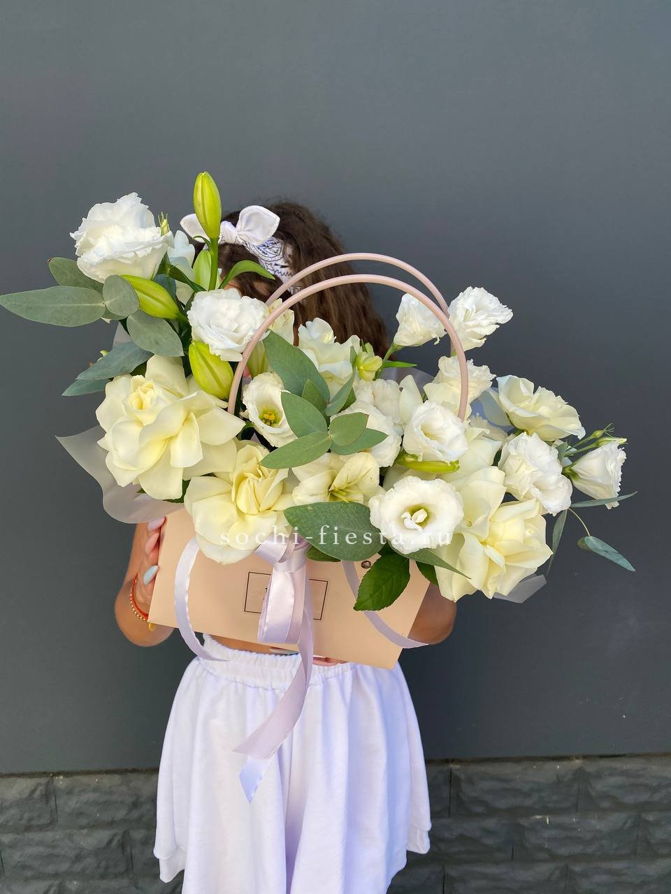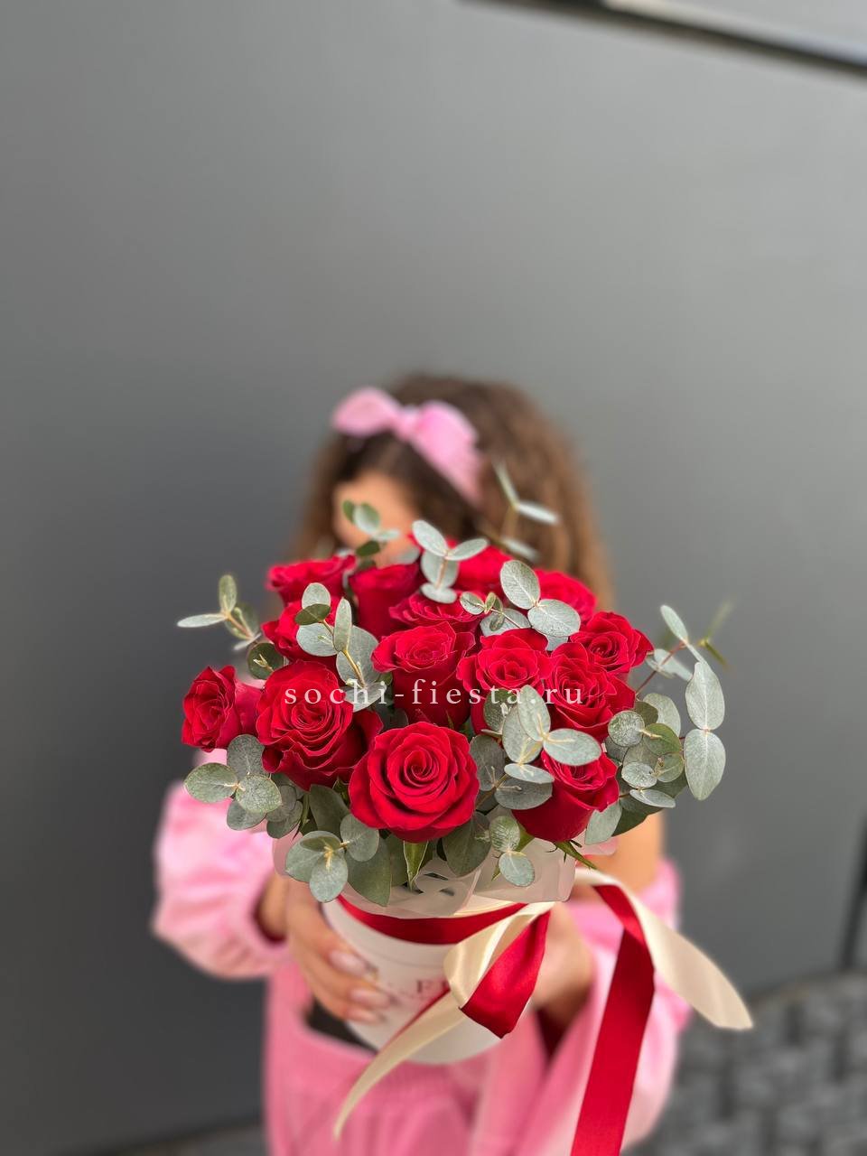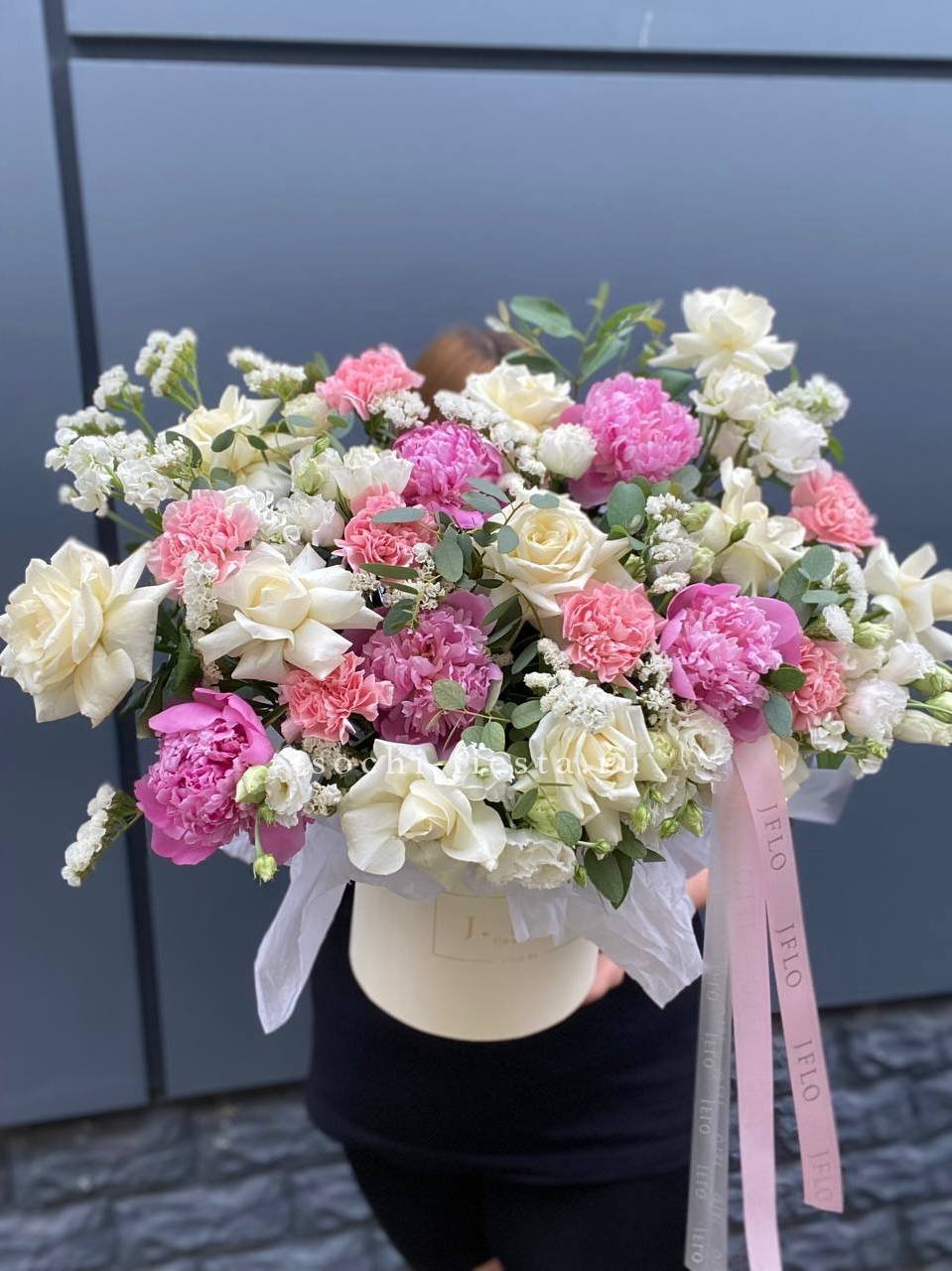 Вывернутые лепестки роз открывают внутреннюю текстуру бутонов и добавляют объема композиции. Гортензия и эустома заполняют пространство между крупными головками и создают многослойность.