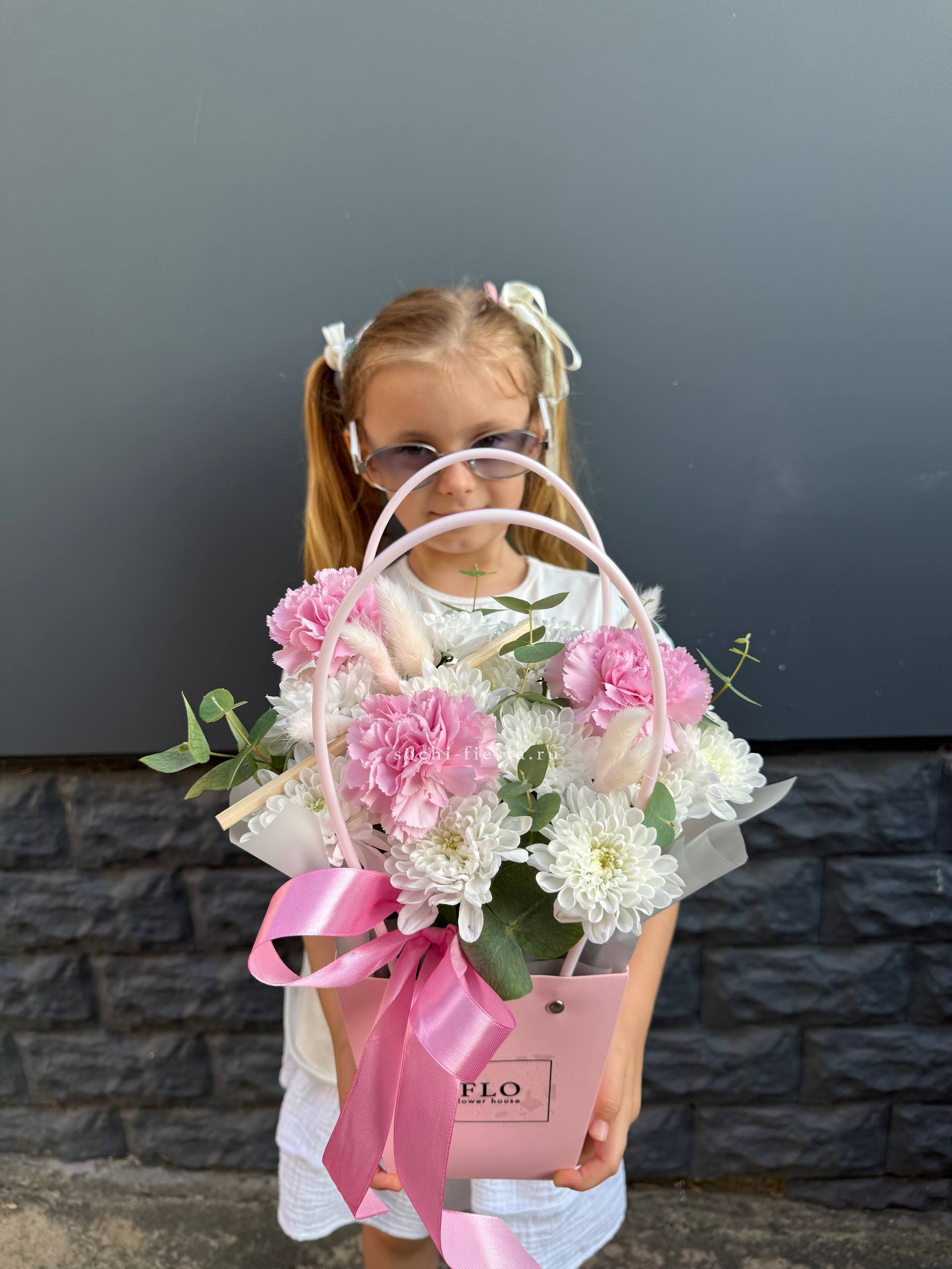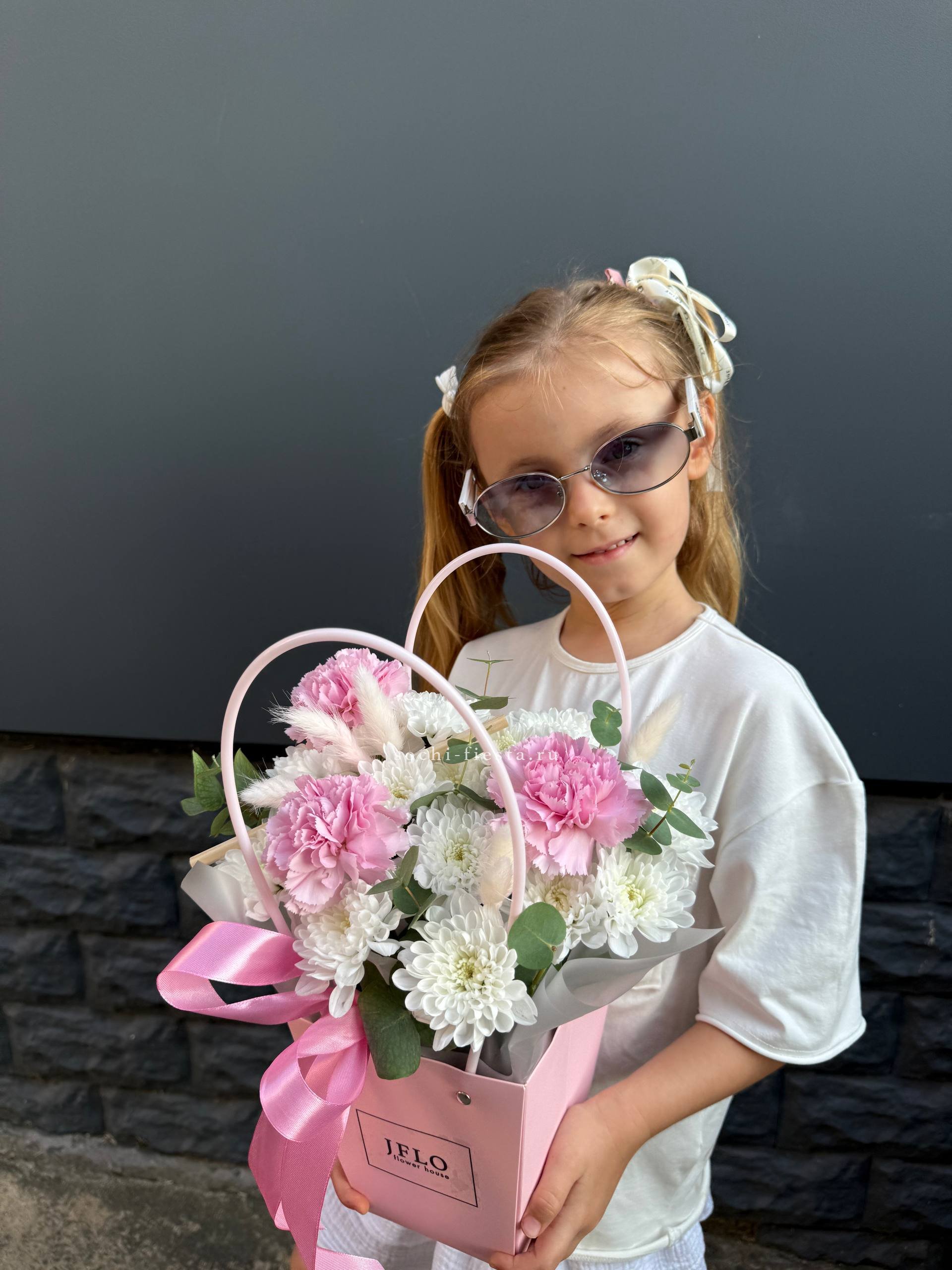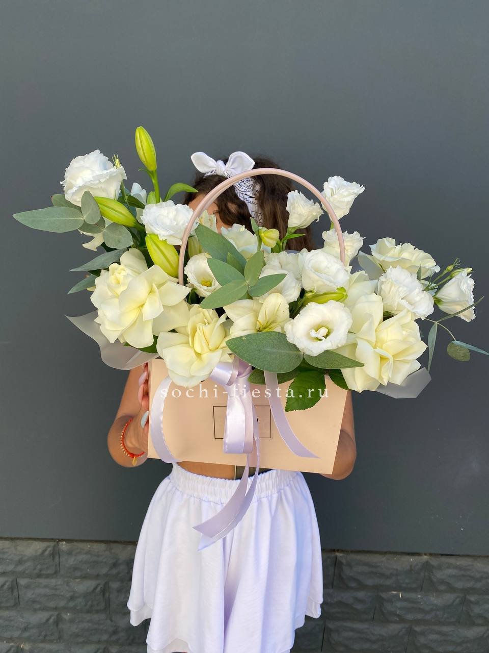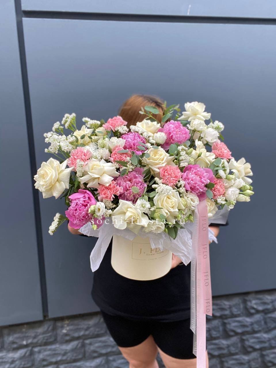 Вывернутые лепестки роз открывают внутреннюю текстуру бутонов и добавляют объема композиции. Гортензия и эустома заполняют пространство между крупными головками и создают многослойность.