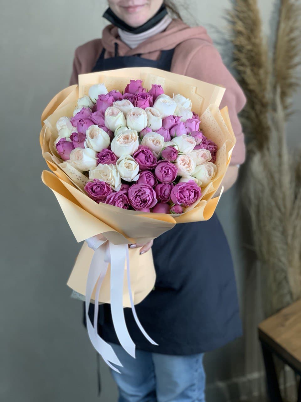 Пионовидные кустовые розы Бомбастик раскрывают многослойные бутоны рядом с воздушной эустомой. Плотная композиция в цилиндре создает объемное и выразительное впечатление.