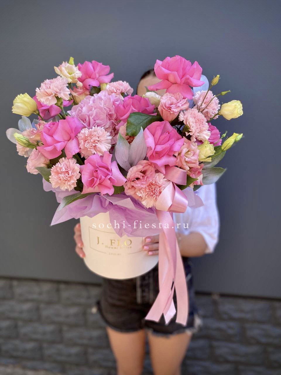 Композиция собрана из альстромерий, эустомы и хризантем с добавлением воздушного хлопка. Мягкие оттенки и разная фактура бутонов создают живописный объем. Дизайнерская упаковка завершает образ.