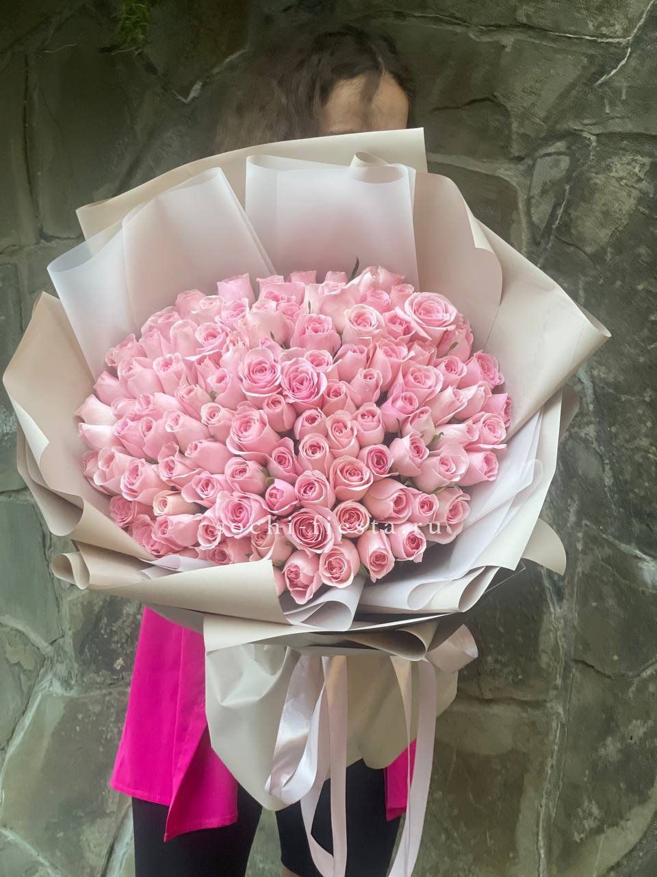 Воздушная композиция в бело-розовой гамме раскрывается мягкими переходами оттенков. Цилиндр нежного розового цвета завершает образ и создает единое цветовое впечатление.