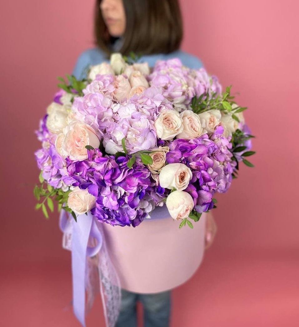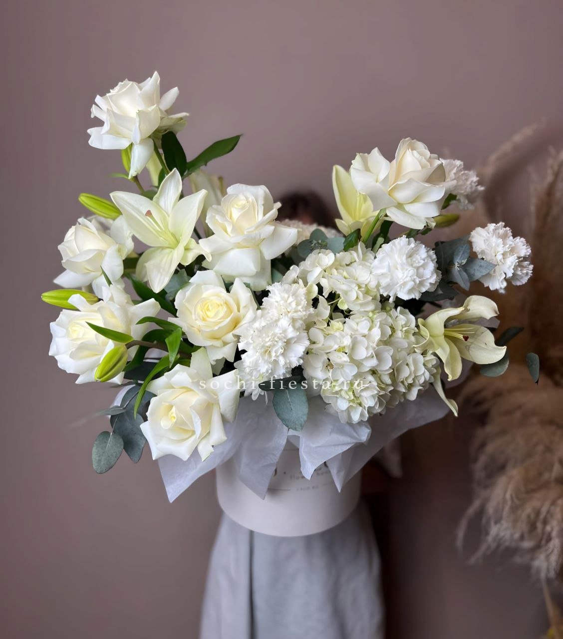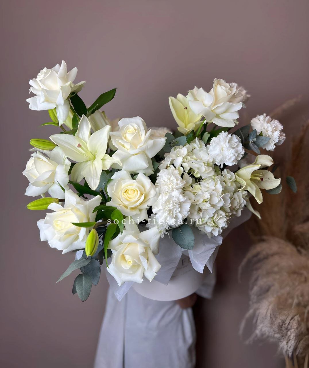 вывернутые белые розы, цилиндр D20, эвкалипт, лента, упаковка.