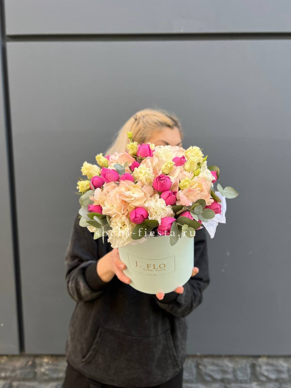 Пионовидные розы раскрывают многослойные бутоны рядом с пышной гортензией и многоцветковой эустомой. Эвкалипт обрамляет композицию мягкими ветвями. Компактная форма бокса делает её удобной для любого пространства.