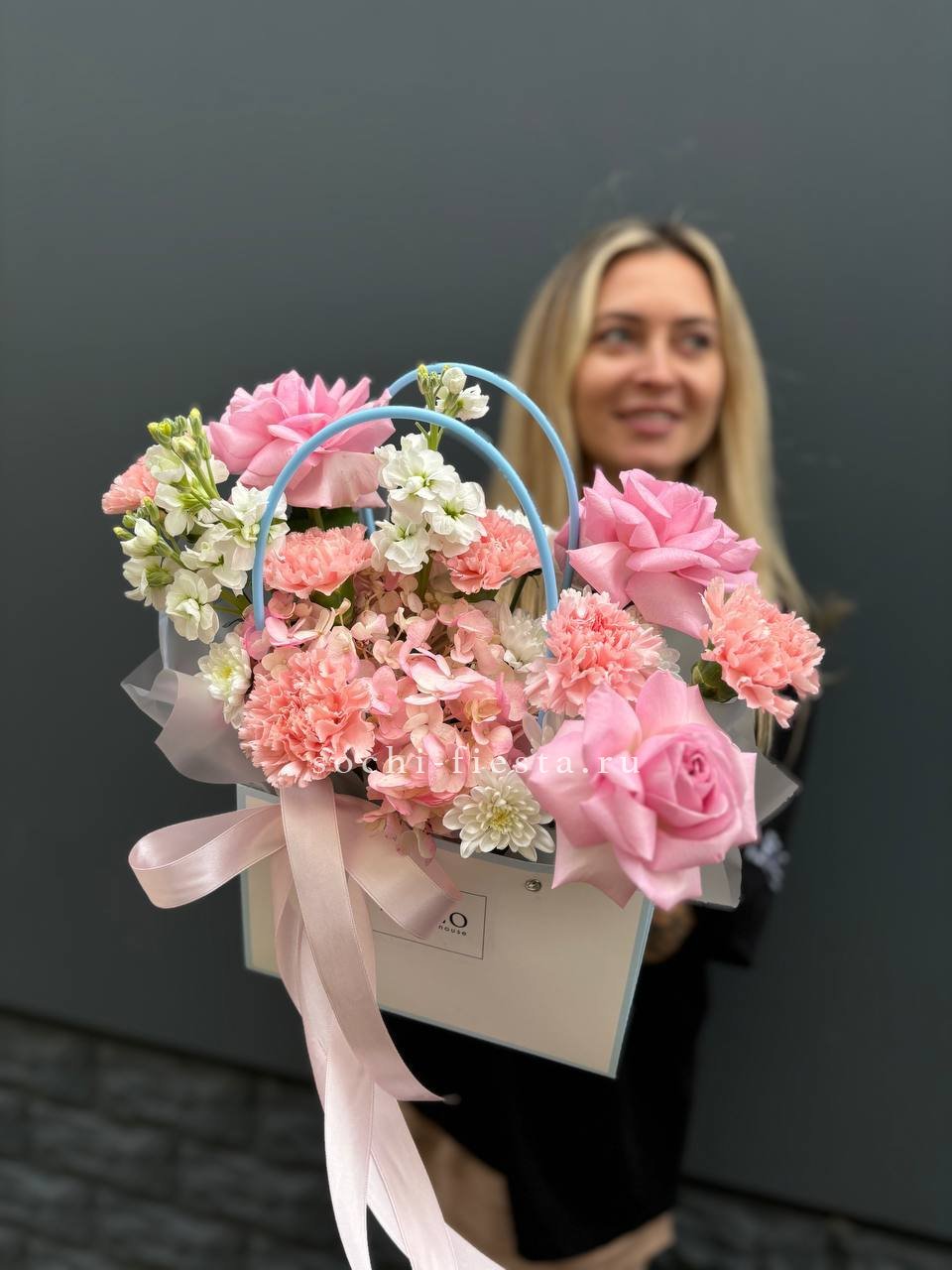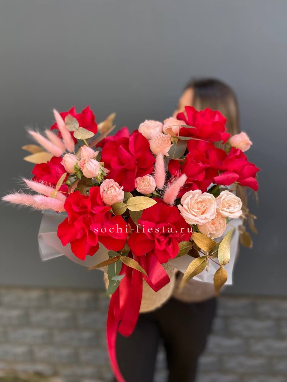красная роза, бомбастик, лагурус, золотой эвкалипт, джутовое кашпо.