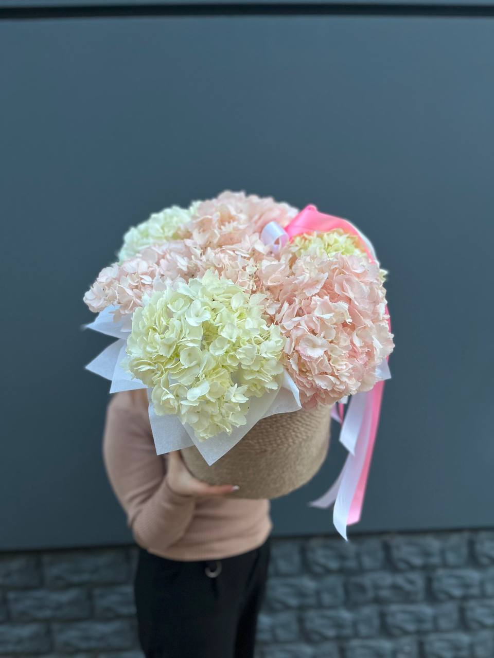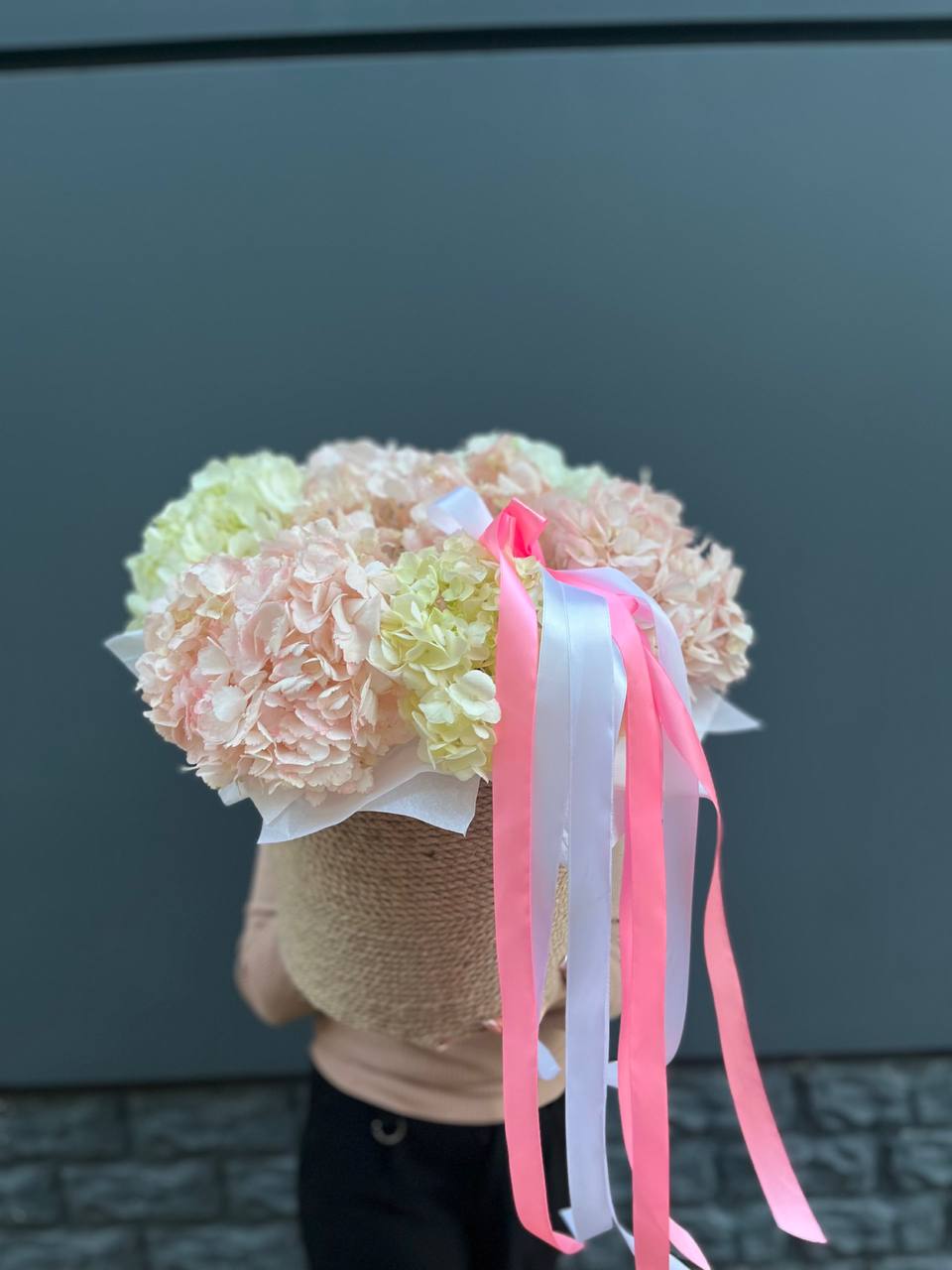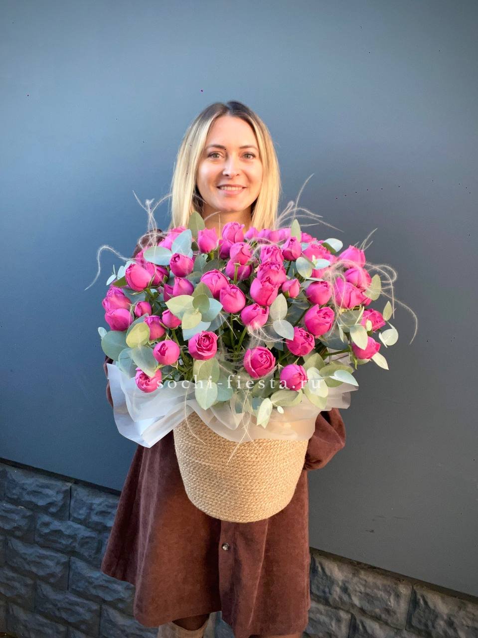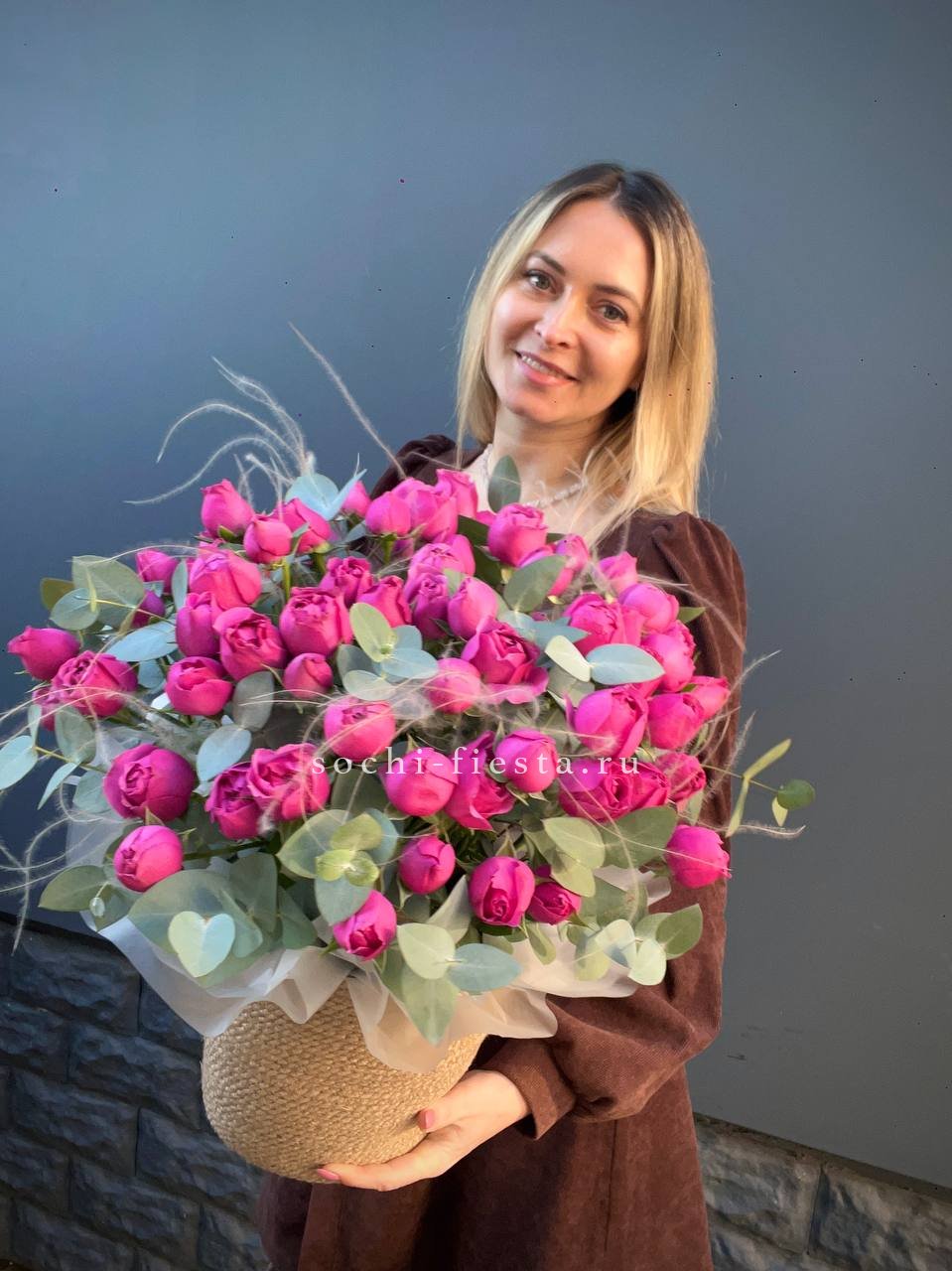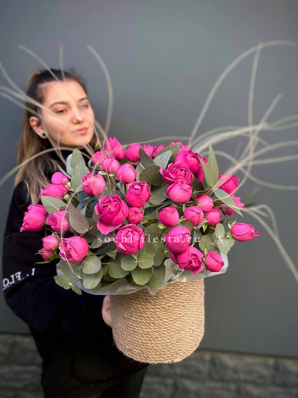 пионовидные розы Мисти Бабблс, джутовое кашпо, стифа, эвкалипт.
