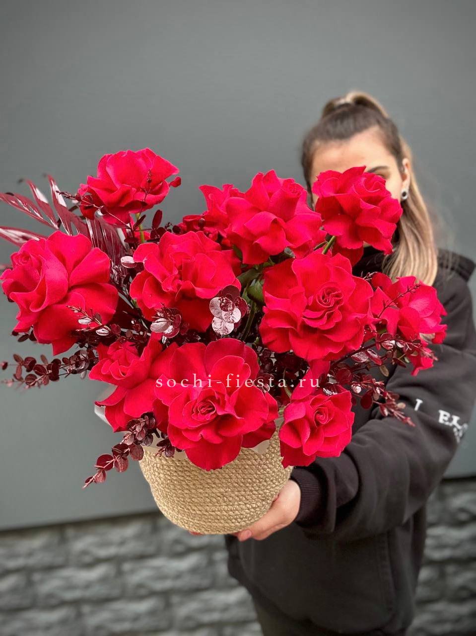 Пионовидные розы в джутовом кашпо