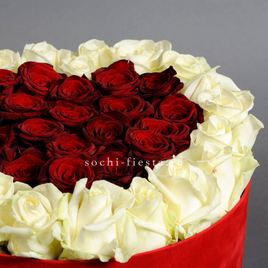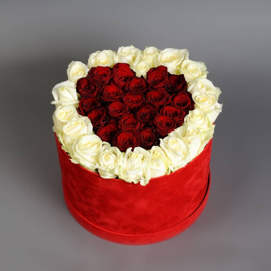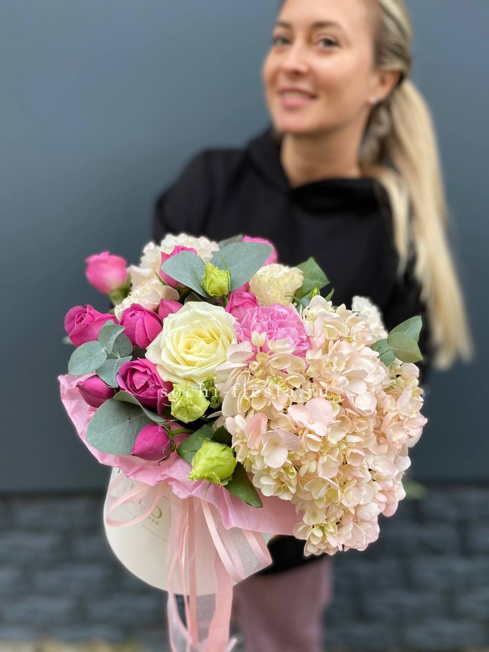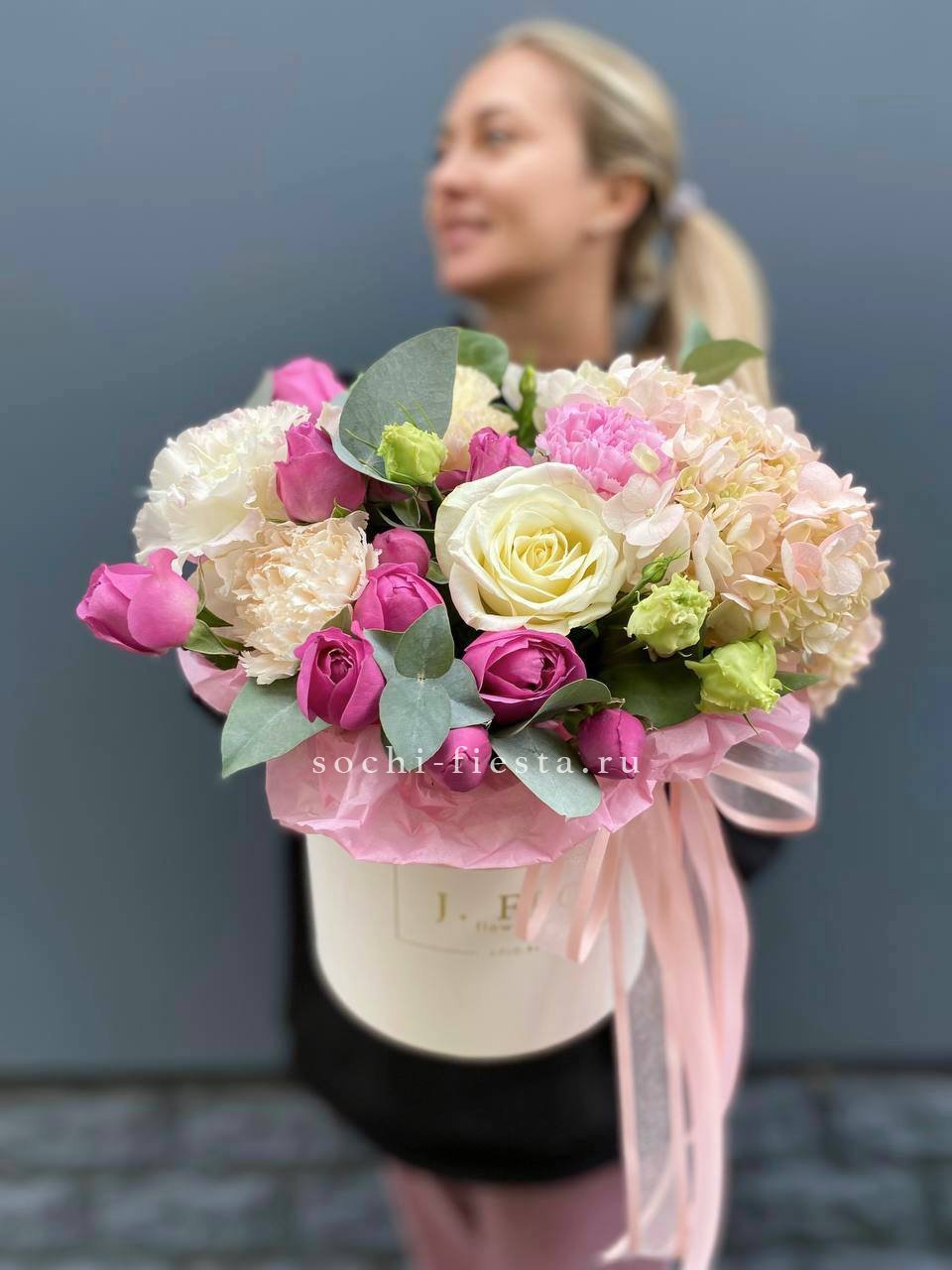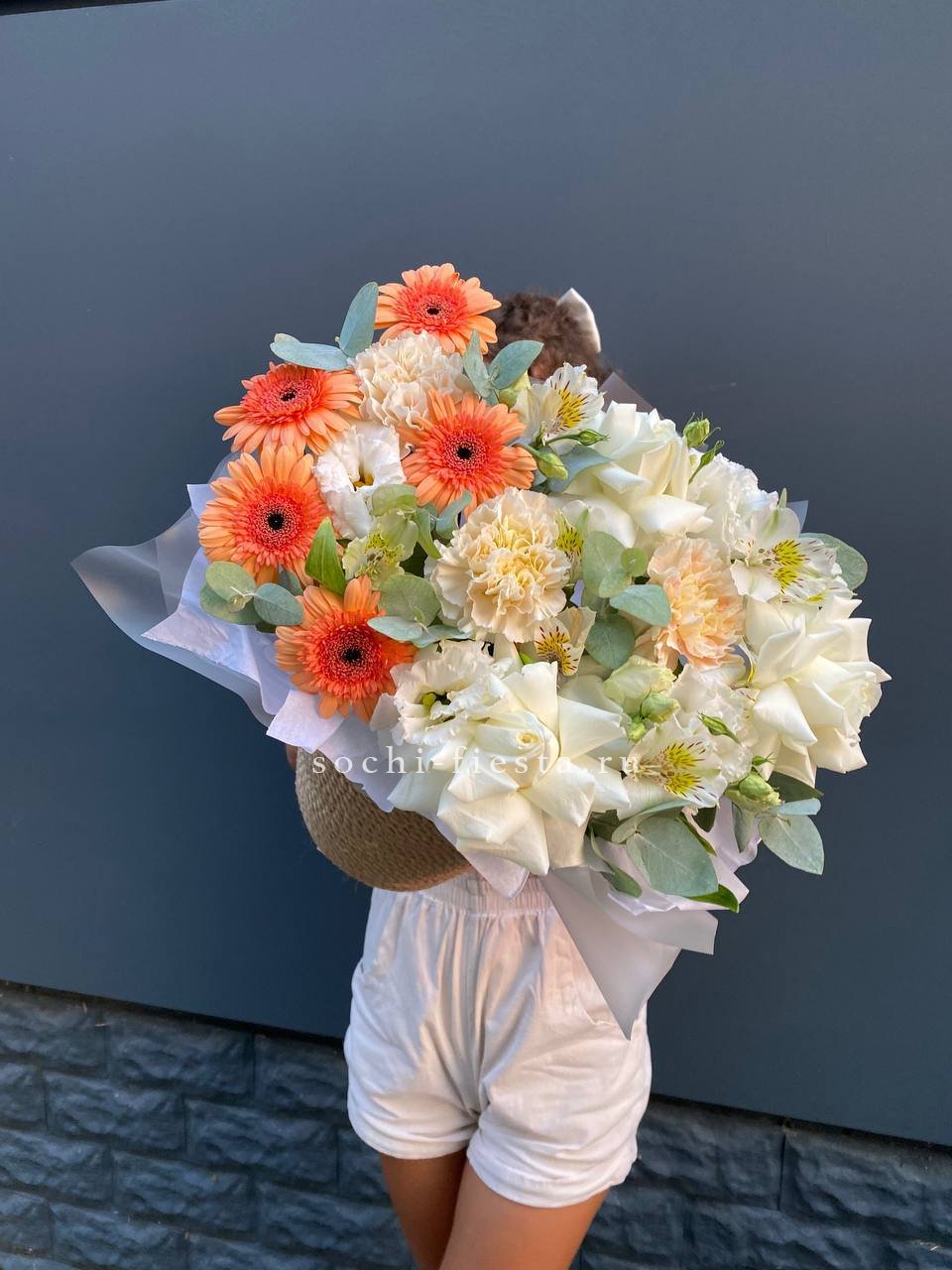 Белые розы и яркие герберы встречаются в одной композиции с диантусами и эустомой. Эвкалипт добавляет зелени, а джутовое кашпо завершает природный образ букета Georgino.