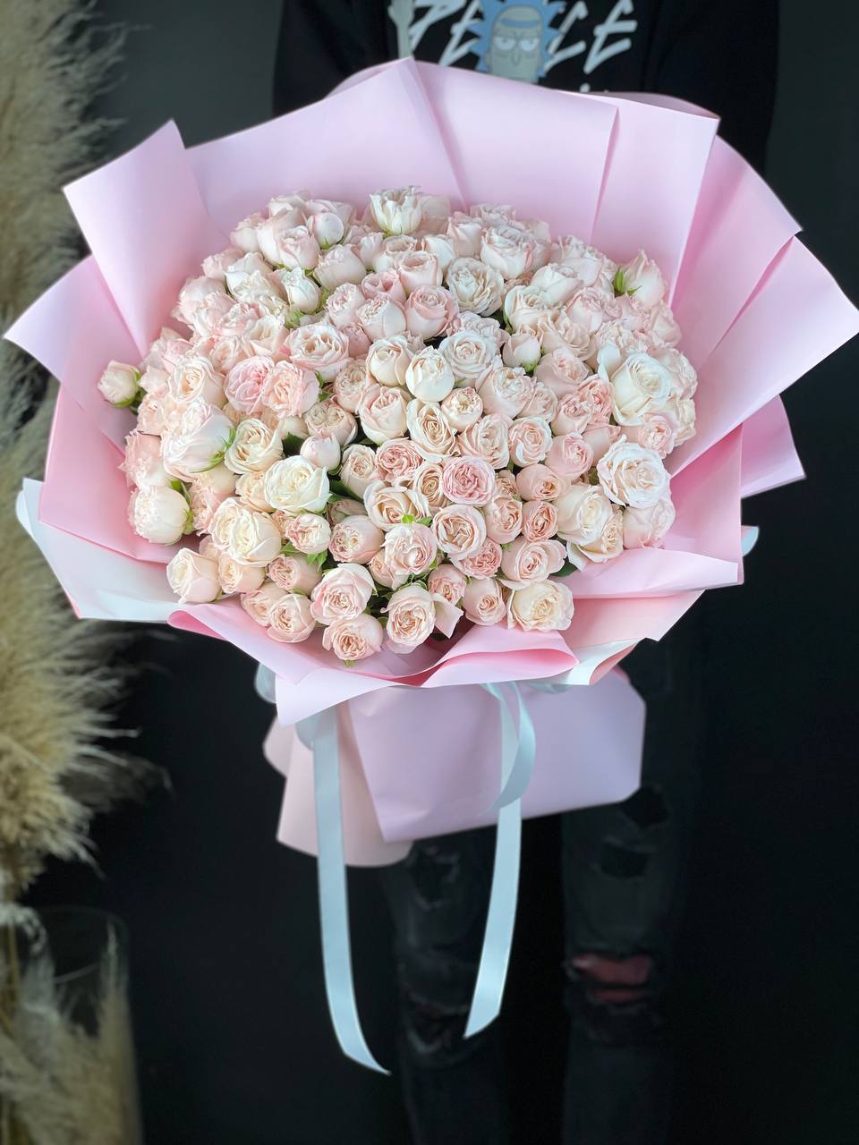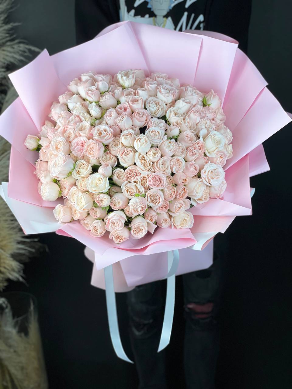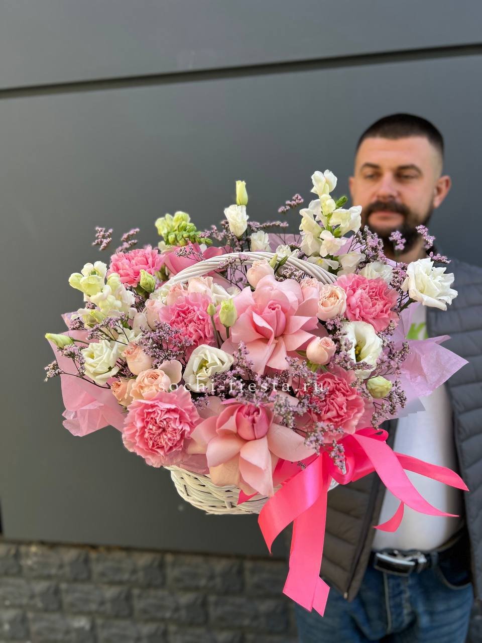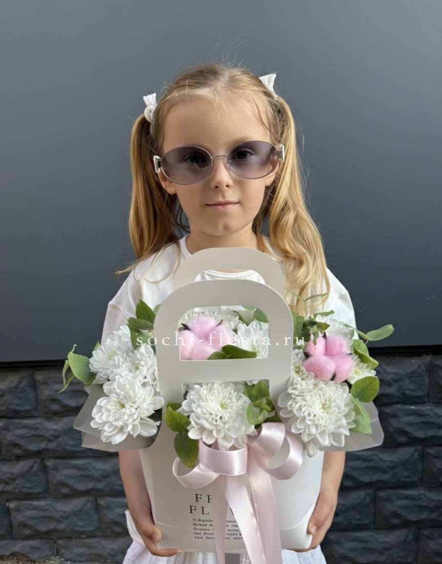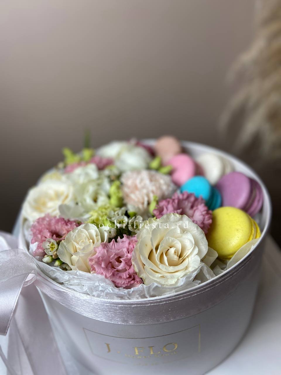 комбинация из цветочных элементов нежных оттенков, 6 макаронс, круглая коробка светлого оттенка.