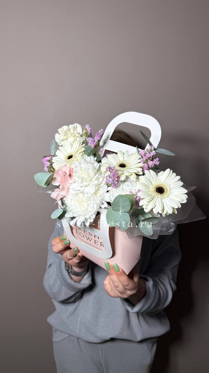 Голубая гортензия задает тон всей композиции, а яркие герберы и диантусы добавляют живости. Компактная форма в сумочке удобна для вручения и не требует вазы.