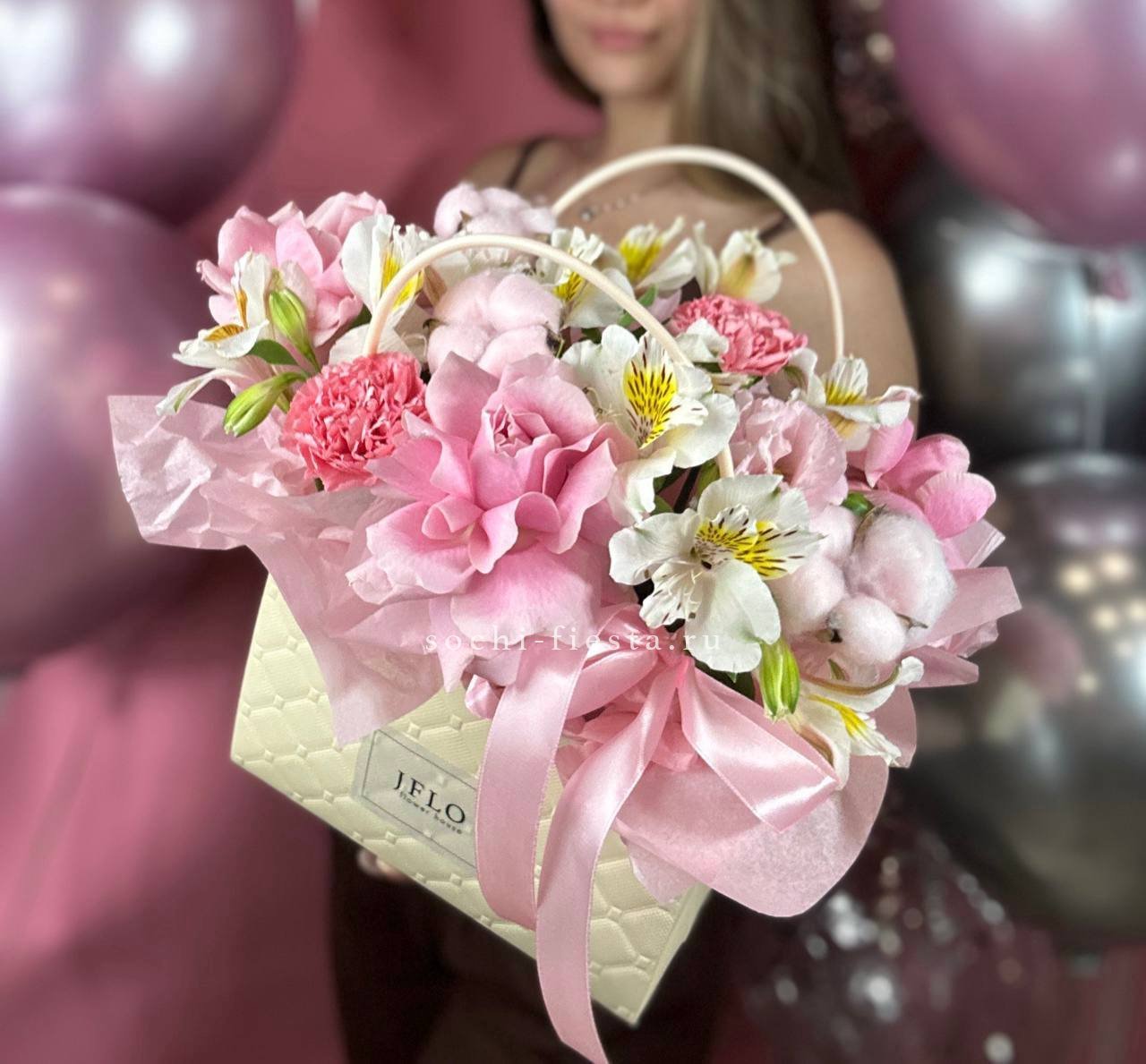 Голубая гортензия и статица задают основной тон, а кустовые розы разбавляют прохладную палитру теплыми нотами. Сумочка держит форму и выглядит собранно.