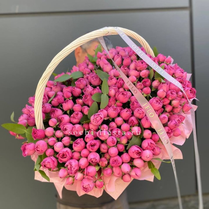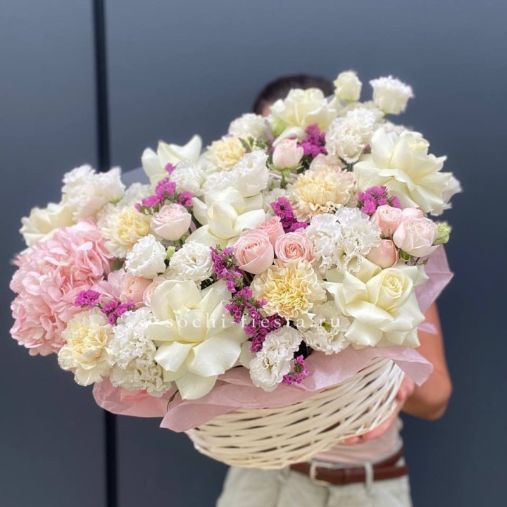 Состав корзин в Ханты-Мансийске определяется текущими поставками и сезоном. Розы Freedom, Mondial, Cappuccino — для классических куполообразных аранжировок. Пионы в мае-июне из свежих поставок: Sarah Bernhardt, Red Charm, Bowl of Cream — главный сезонный продукт. Хризантема, альстромерия, гербера — для объёмных торжественных наполнений. Эустома, ранункули — для садовых корзин. Флорист строит состав под конкретный запрос.