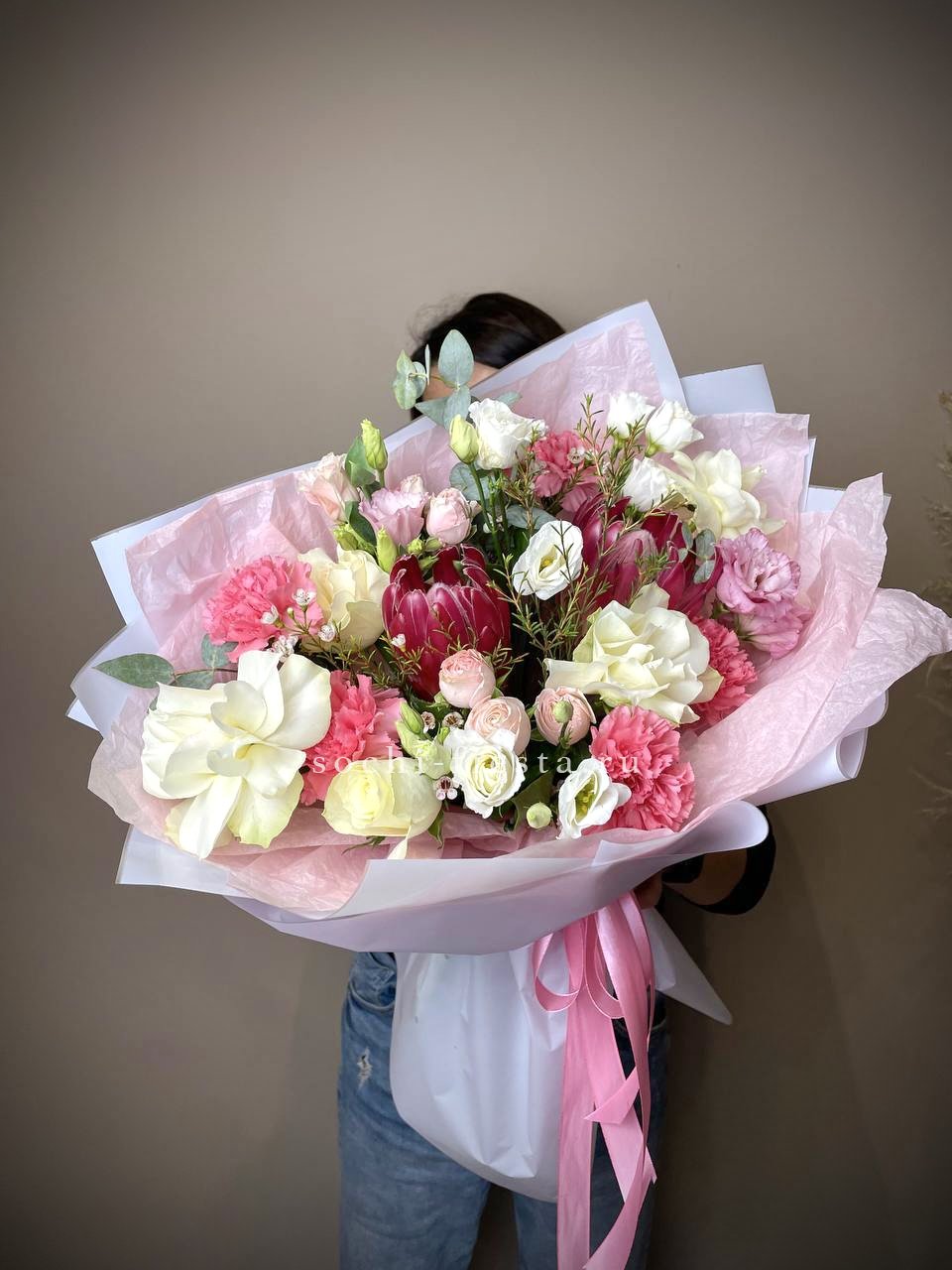 Триста пятьдесят один бутон ярко-алого цвета создают впечатление плотной цветочной волны. Это композиция, которая заполняет собой всё пространство и приковывает взгляд с первой секунды.