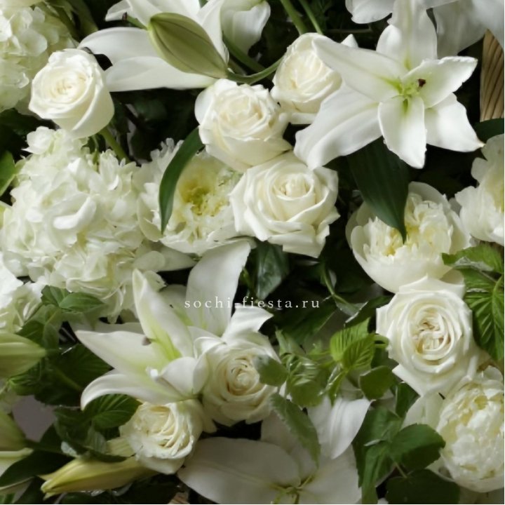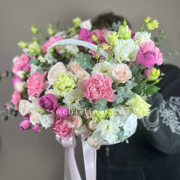 Состав корзин в Ханты-Мансийске определяется текущими поставками и сезоном. Розы Freedom, Mondial, Cappuccino — для классических куполообразных аранжировок. Пионы в мае-июне из свежих поставок: Sarah Bernhardt, Red Charm, Bowl of Cream — главный сезонный продукт. Хризантема, альстромерия, гербера — для объёмных торжественных наполнений. Эустома, ранункули — для садовых корзин. Флорист строит состав под конкретный запрос.