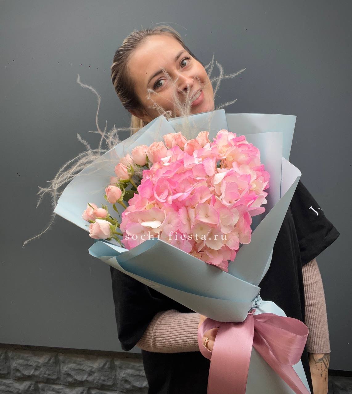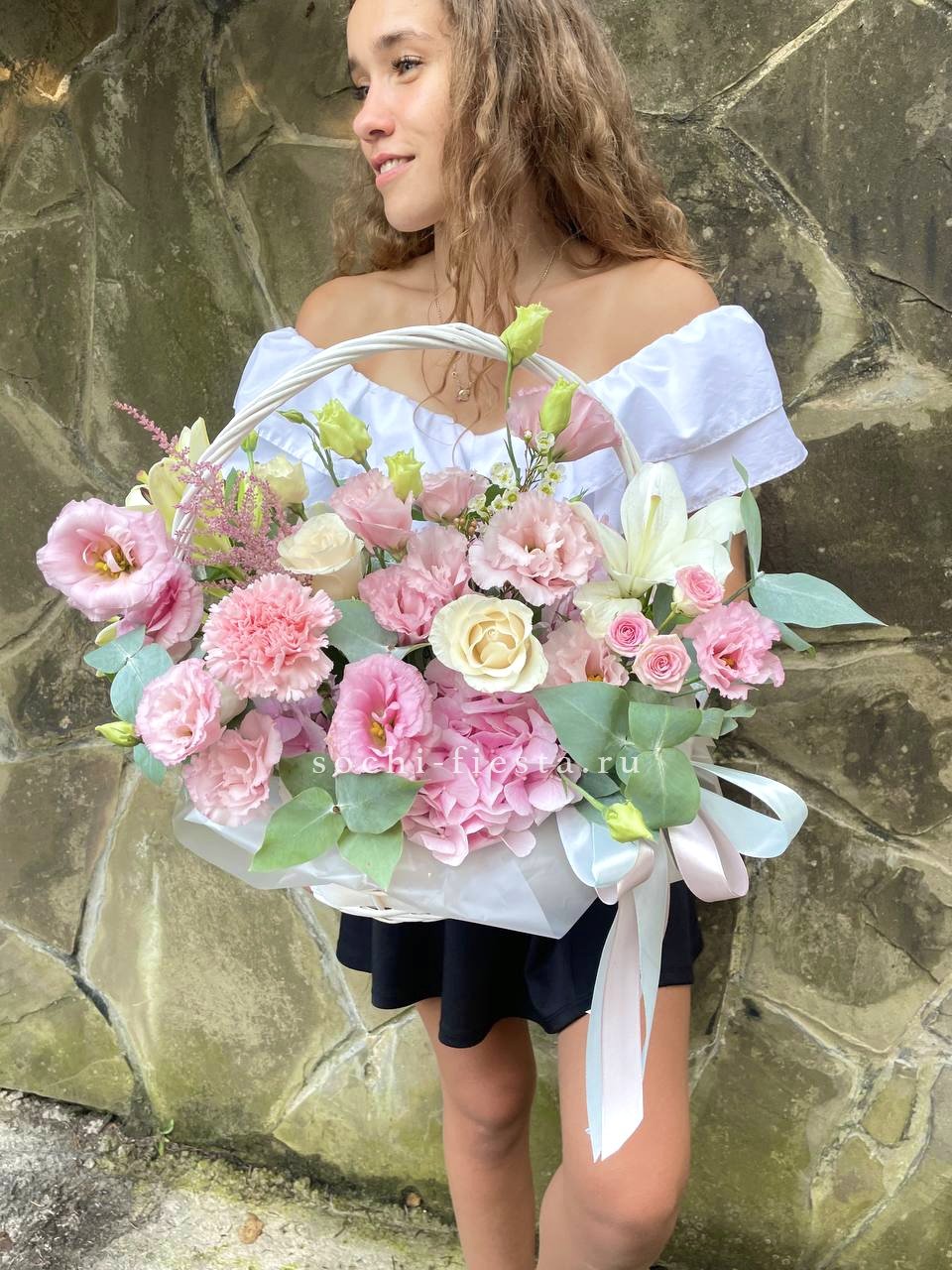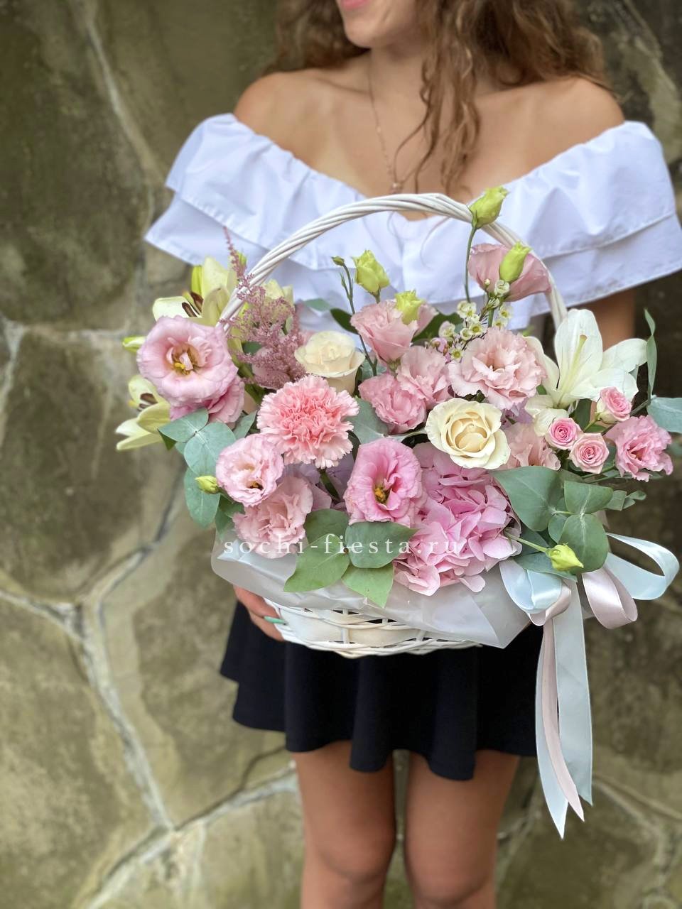 Гортензия задаёт объём, лилии вытягивают силуэт вверх. Диантусы и кустовые розы заполняют пространство между крупными соцветиями. Корзина Mia выглядит завершённой и продуманной.