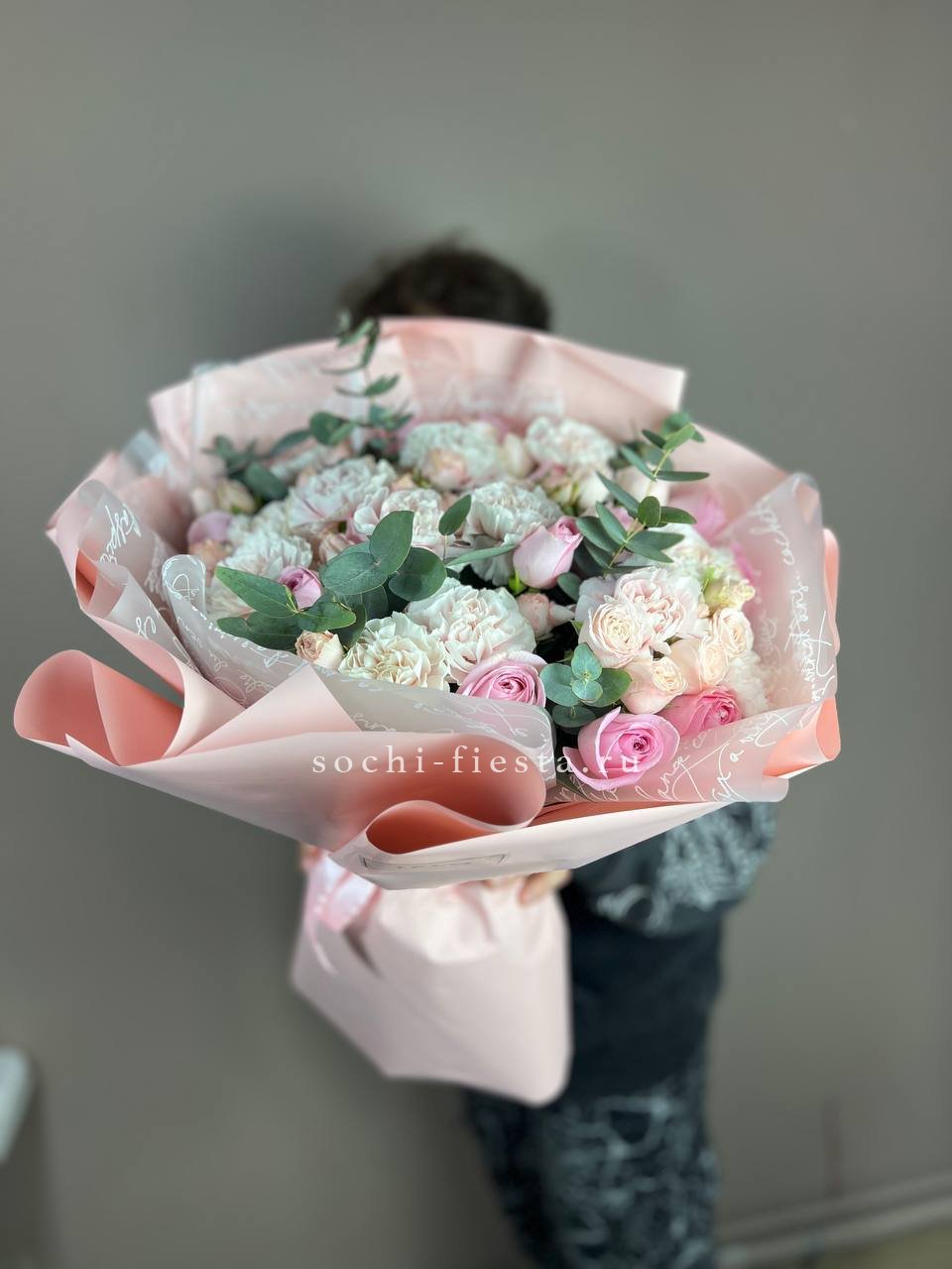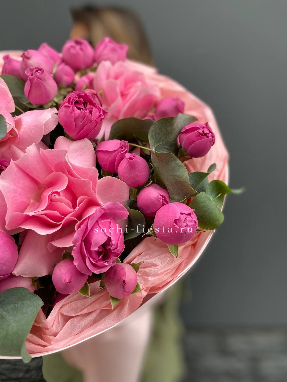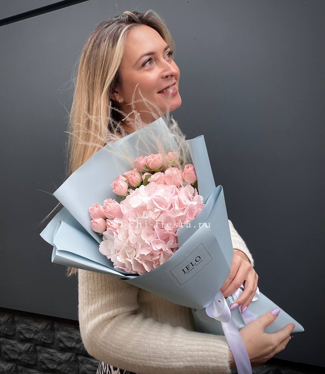 Гортензия задаёт объём, лилии вытягивают силуэт вверх. Диантусы и кустовые розы заполняют пространство между крупными соцветиями. Корзина Mia выглядит завершённой и продуманной.