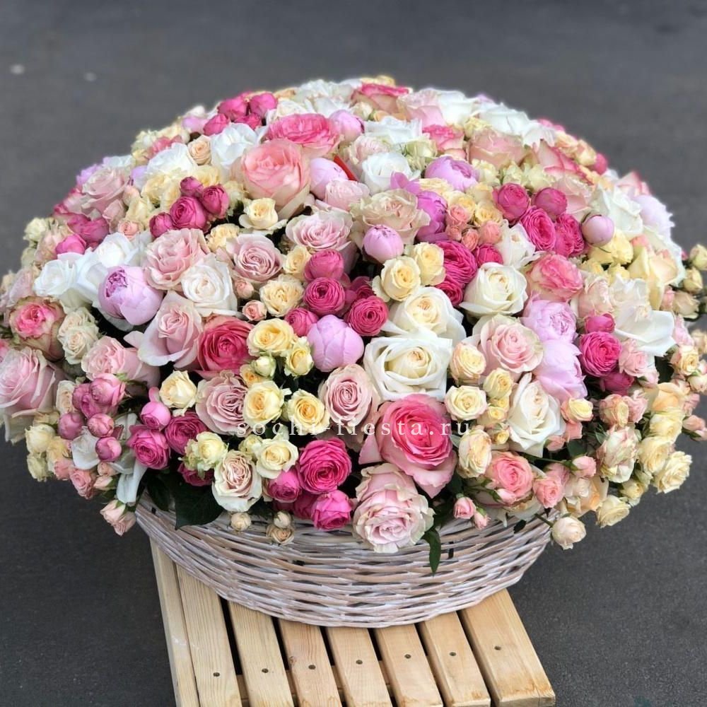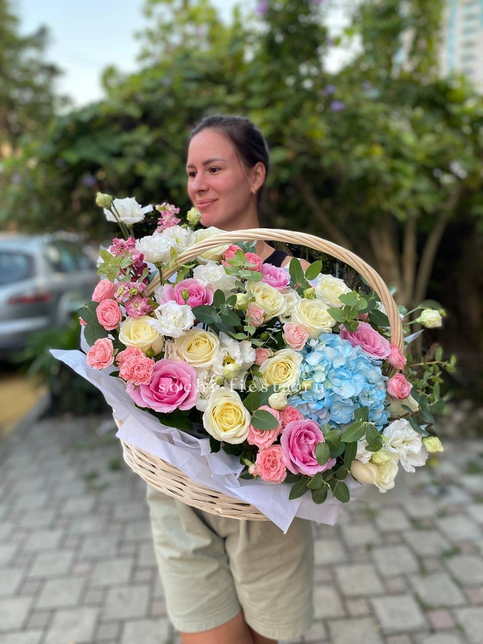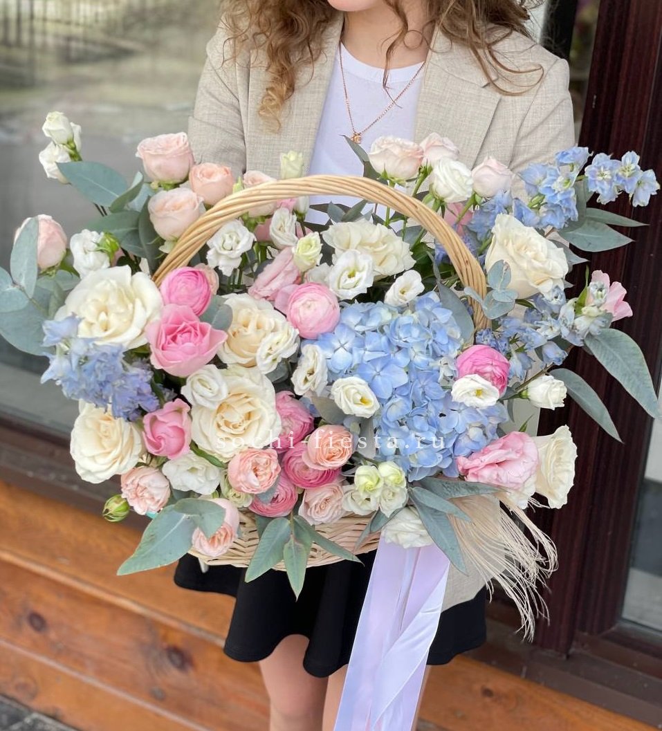 Плотная россыпь бутонов формирует округлую композицию с мягкими переходами оттенков. Розы и эустома создают объёмную текстуру, а пышные соцветия гортензии заполняют пространство между ними. Корзина удобна для размещения на столе или комоде.