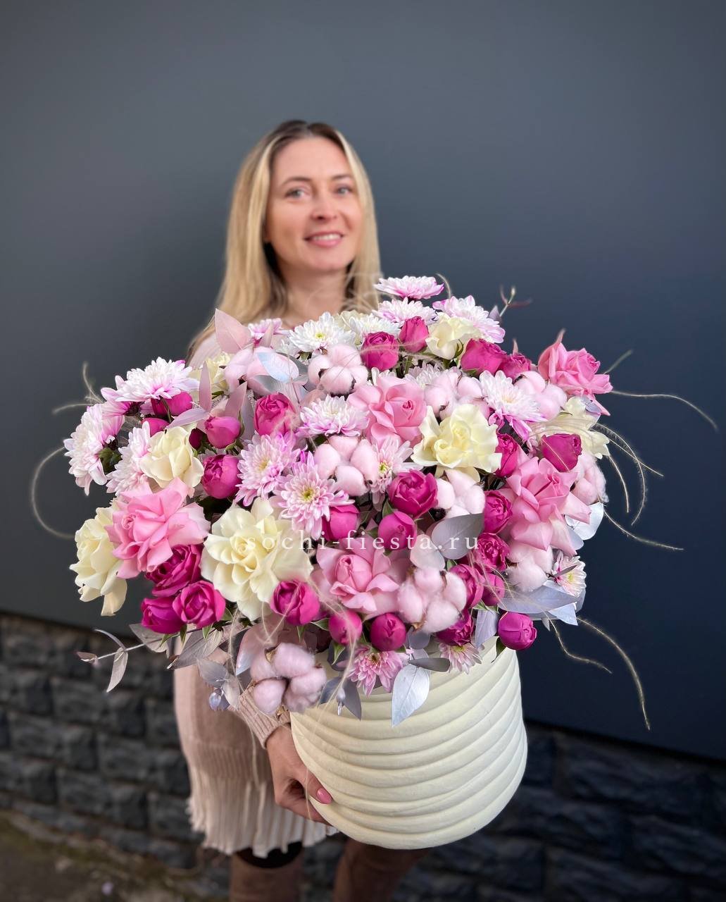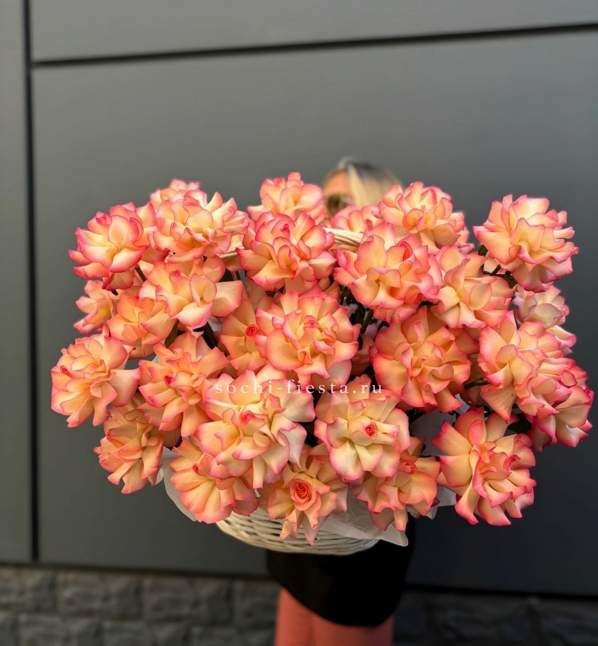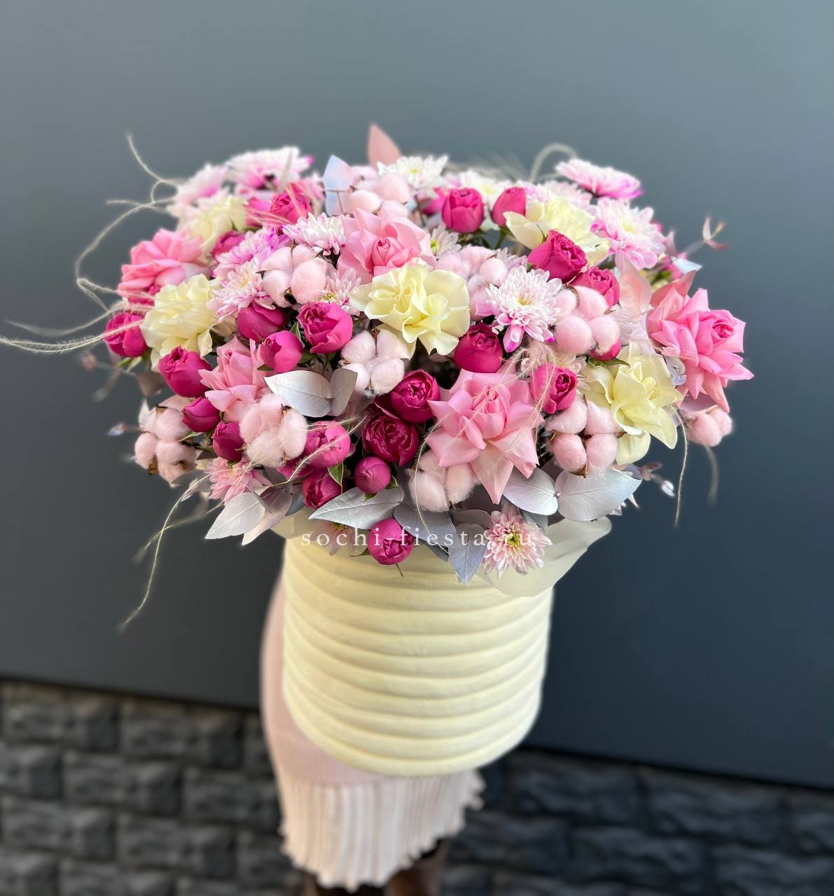 Плотная россыпь бутонов формирует округлую композицию с мягкими переходами оттенков. Розы и эустома создают объёмную текстуру, а пышные соцветия гортензии заполняют пространство между ними. Корзина удобна для размещения на столе или комоде.