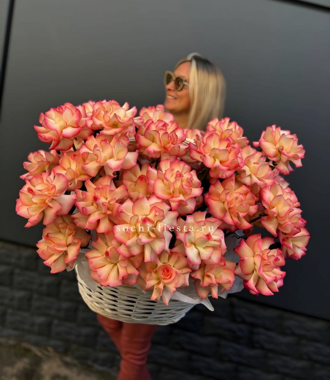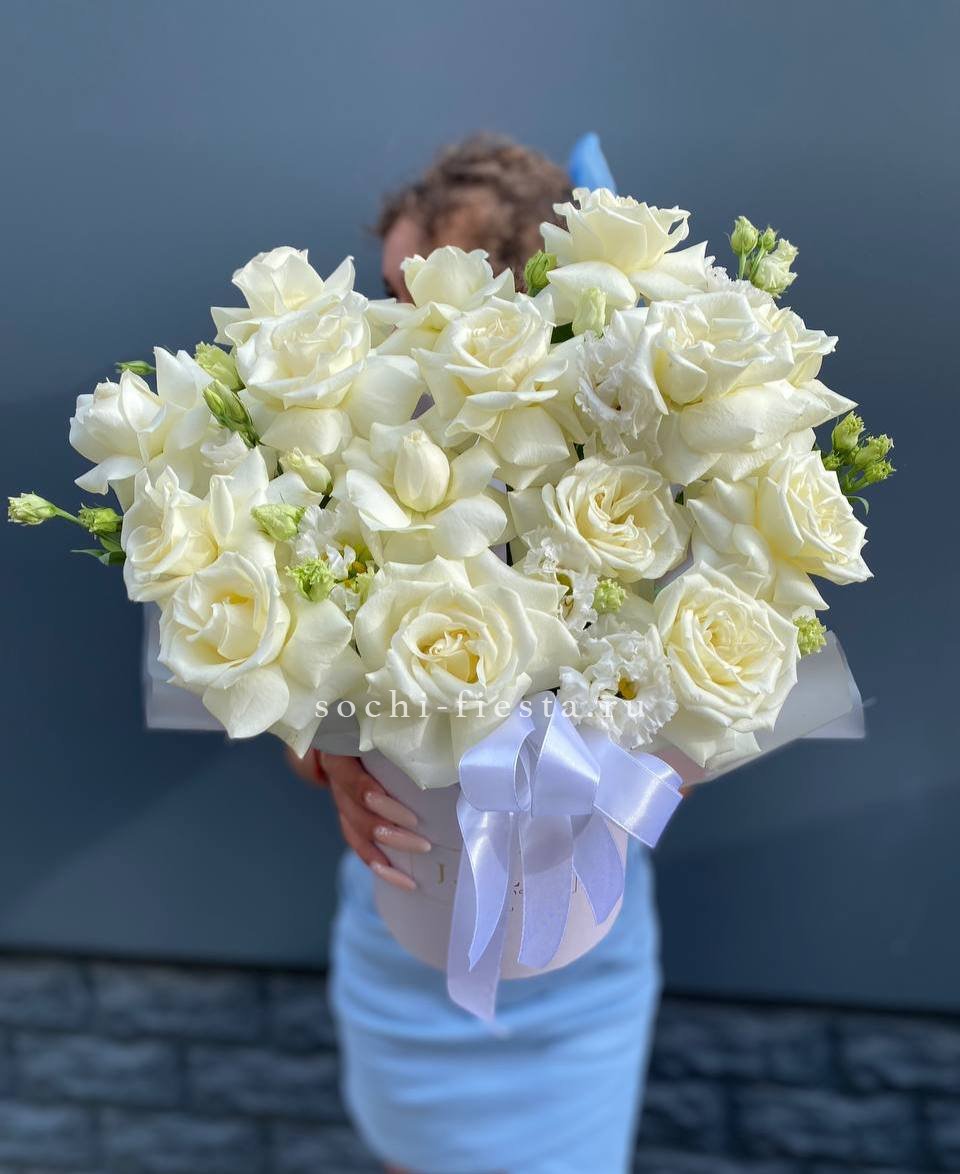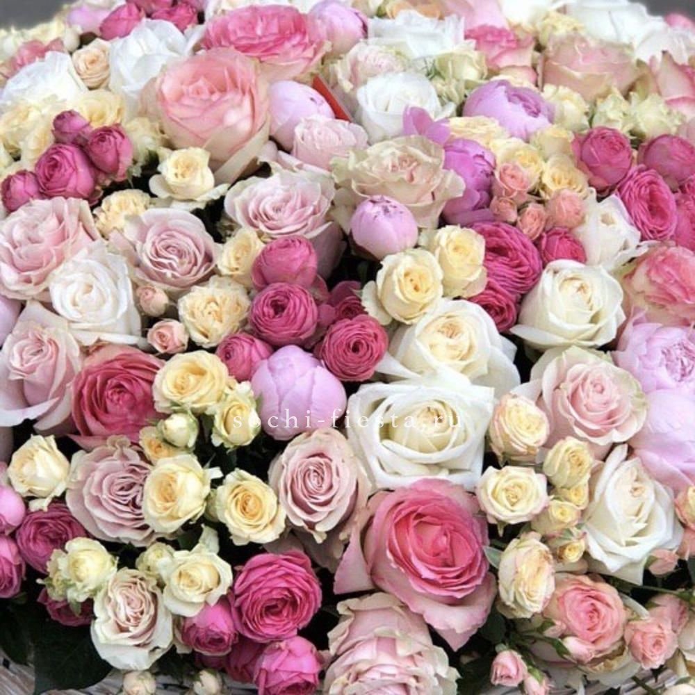 розы, эустома, гортензия, бомбастик, маттиола ( или аналог), эвкалипт, корзина.