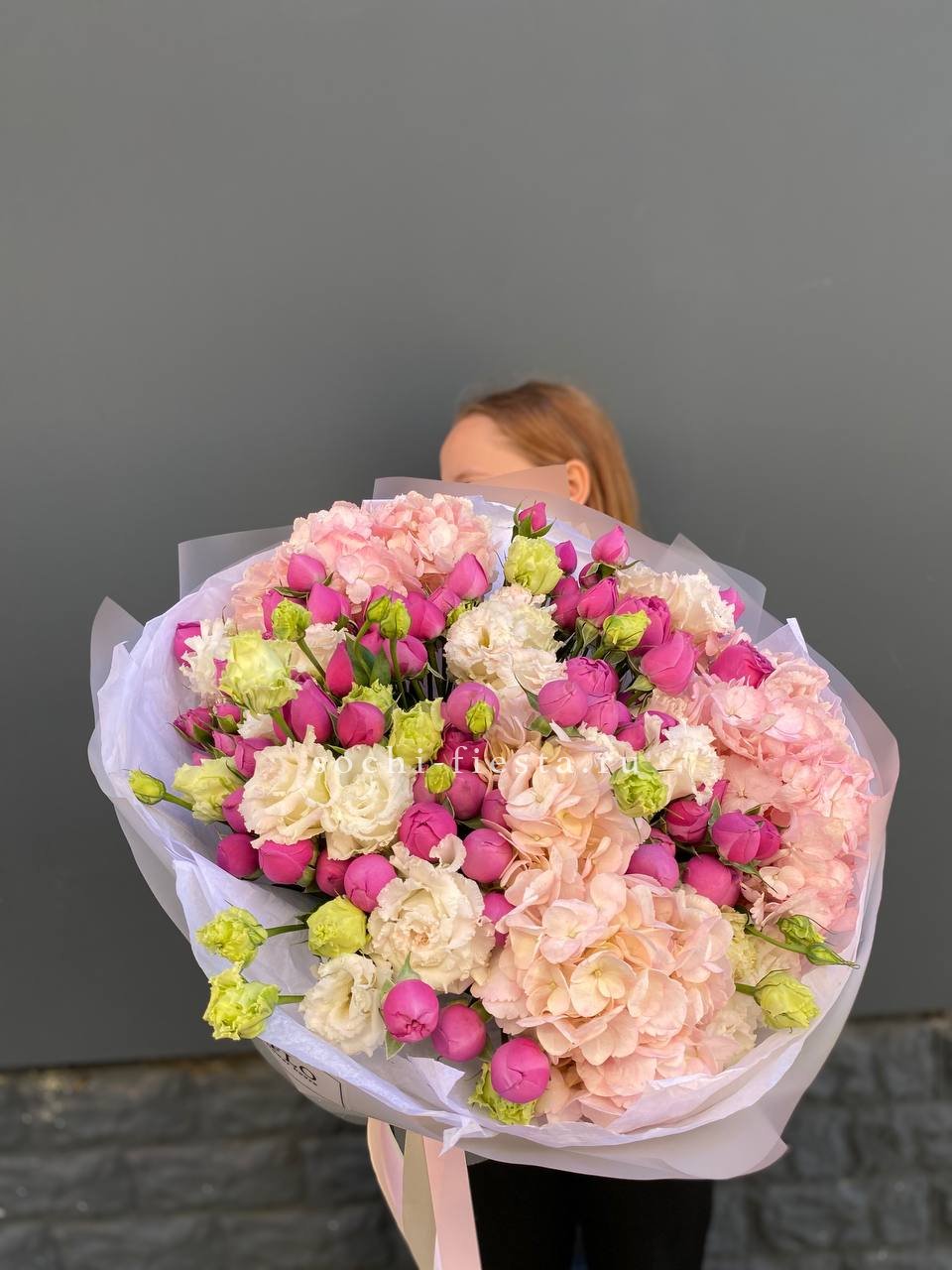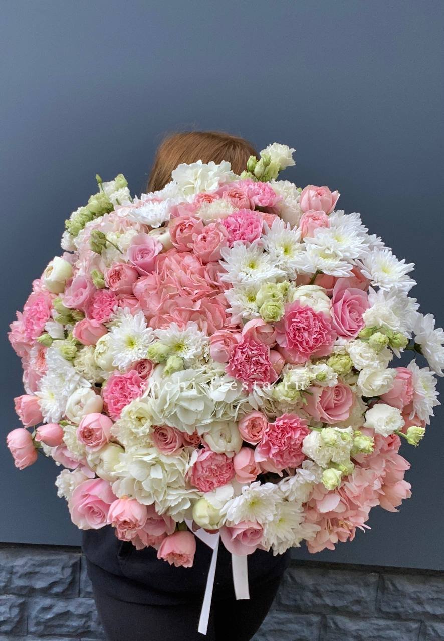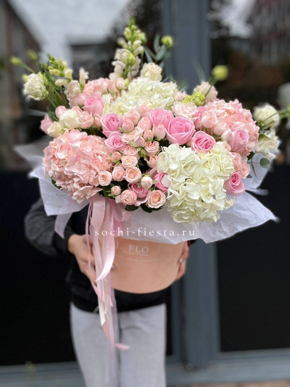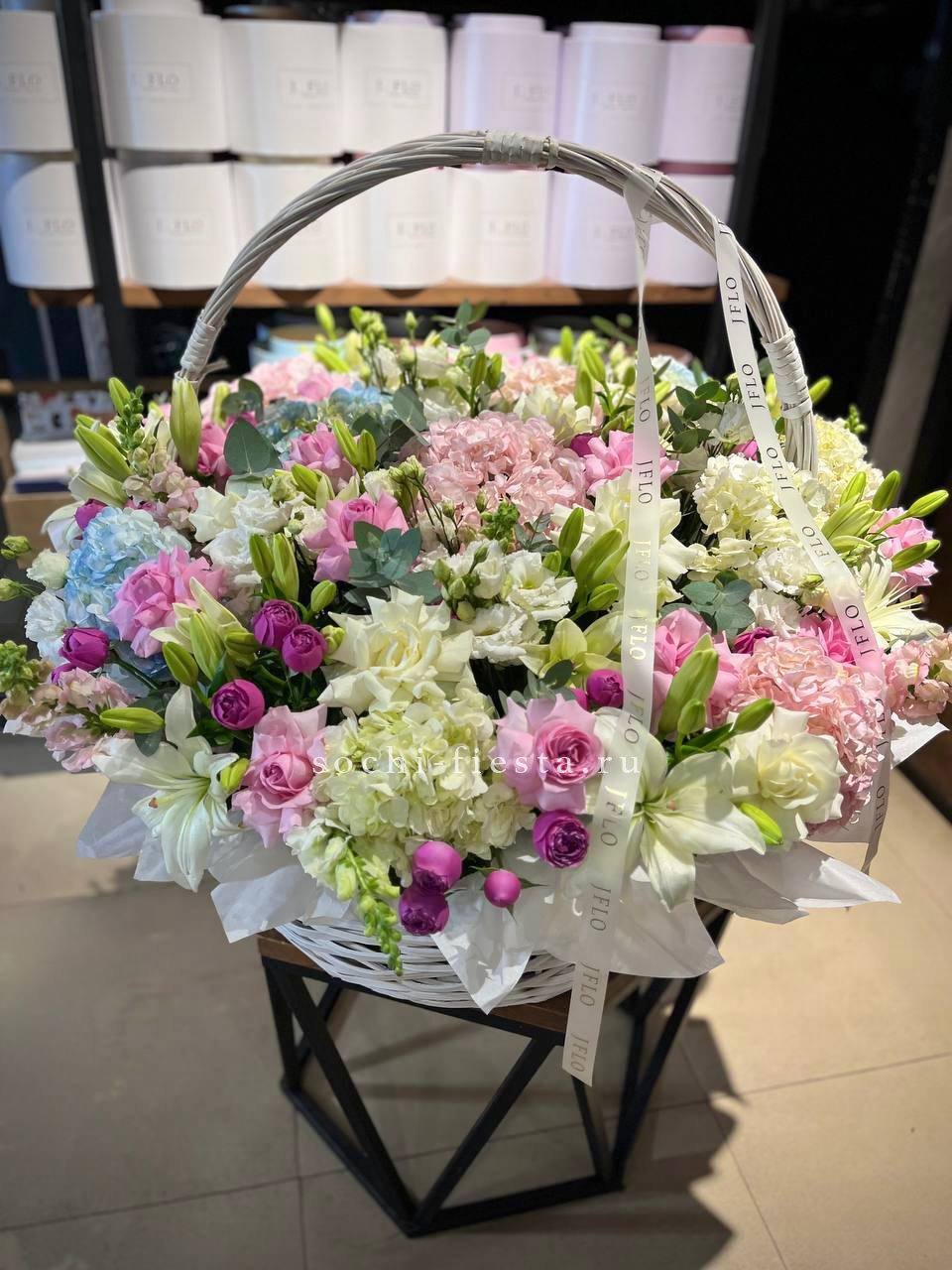 цветочная корзина с розами, мисти баблс, диантусами и гортензией.