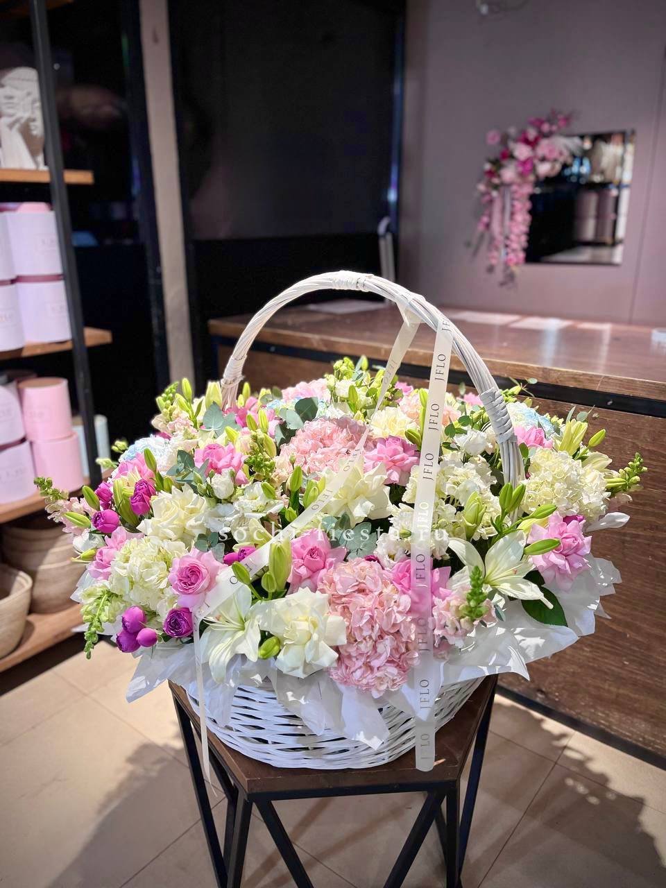 Эта роскошная интерьерная корзина — настоящее воплощение цветущего сада, наполненного нежностью и свежестью. Она выглядит невероятно объемной и фактурной благодаря гармоничному сочетанию классических и экзотических цветов.